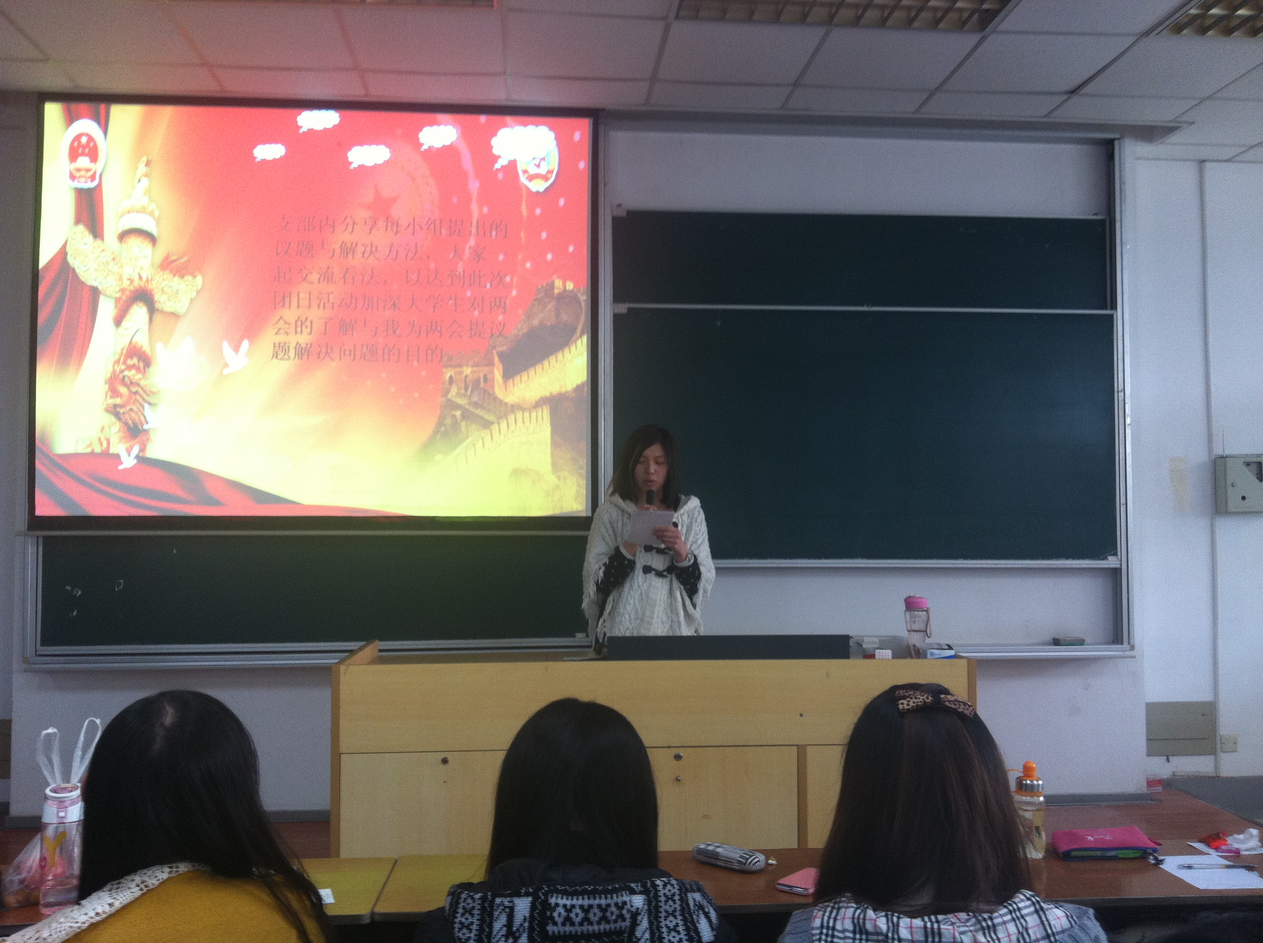 1211101团支部选取民生问题和大学问题为切入点,模拟“两会”,扮演人大代表进行提案并讨论;1211102团支部组织支部团员观看截取的六段“两会”视频并就视频中代表们提出的农民工就业问题、粮食问题进行了讨论并发表感想,同时也就理工科大学外语专业学生该如何发展提出了自己的看法;1211103团支部采用“一站到底”益智趣味问答形式深入学习“两会”知识;1211104团支部设定了几个基层典型人物进行模拟人大代表选举;1211201团支部针对“钓鱼岛”等问题引发的日语专业就业难问题进行讨论,提出日语专业学生该如何趋利避害、逆流勇上,并积极参与新华网“我为两会微建言”板块和1211201团支部腾讯微博的讨论。