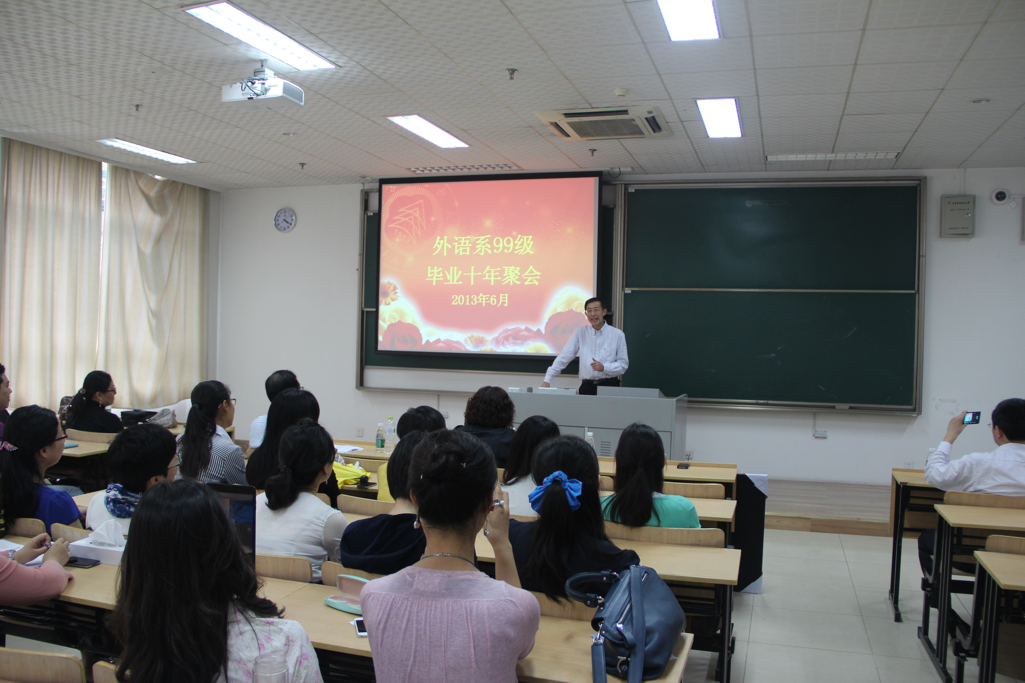 2013年6月11日,我院99级校友毕业十年重返母校活动在明故宫校区进行,此次活动共包括校园漫步、主题班会、回味南航、校史参观、重温课堂、师生欢聚等环节。来自英语(国际贸易)专业的129911、129912班和英语(民航业务)专业的129981、129982班的共计40余位校友在毕业十年后再次相聚在共同学习生活了四年的母校,重温同窗情谊,共话师生恩情。