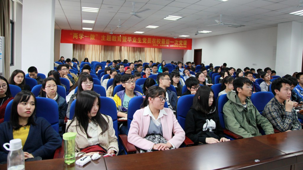 为积极响应党中央“学党章党规、学系列讲话,做合格党员”号召,推进落实我校“党员先锋计划”,4月27日,我院与理学院、计算机科学与技术学院联合开展的“两学一做”主题教育暨毕业生党员在校最后一次党课活动在将军路校区开展。本次活动主题为“凝聚在党旗下,与祖国共奋进”,邀请到校关工委常务副主任丁荣茂担任主讲人,来自三个学院的150余名学生党员参加了教育活动。