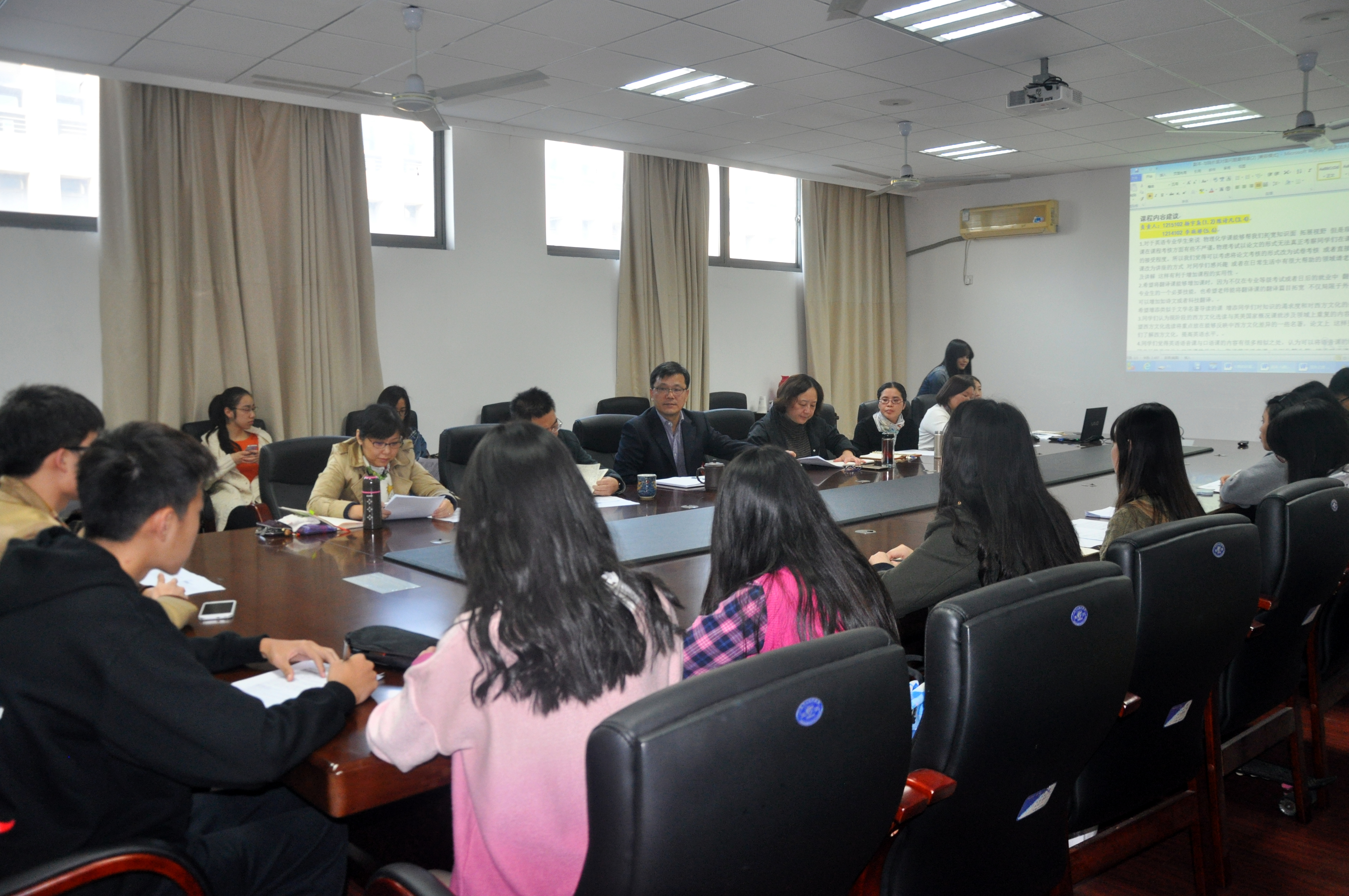 经过前期广泛的意见征集与整理,学生代表们围绕师生共同关注的课程设置、课堂教学、专业分流、本科生导师制、实习实践安排、国际化发展等话题踊跃发言,分享了现状调查结果和同学们的意见、建议。在课程设置上,英语专业学生代表提出了部分课程内容上略有重复,日语专业学生建议低年级的专业课程应有所增加;在课堂教学上,有同学建议部分老师的课堂安排更加合理,课程考核方法需提前明确等问题;对于学院即将实施的本科生导师制,学生代表们在导师的选择方法、考核方式等方面提出了具体建议;在国际化发展上,同学们期待学院多争取适合我院学生的交换项目,更加支持模拟联合国大会等国际性活动,并有机会开展与留学生的交流活动;大四学生代表也积极提出希望得到学院更加合理地安排课程时间以利于学生进行有针对性的、高质量的实习等建议。