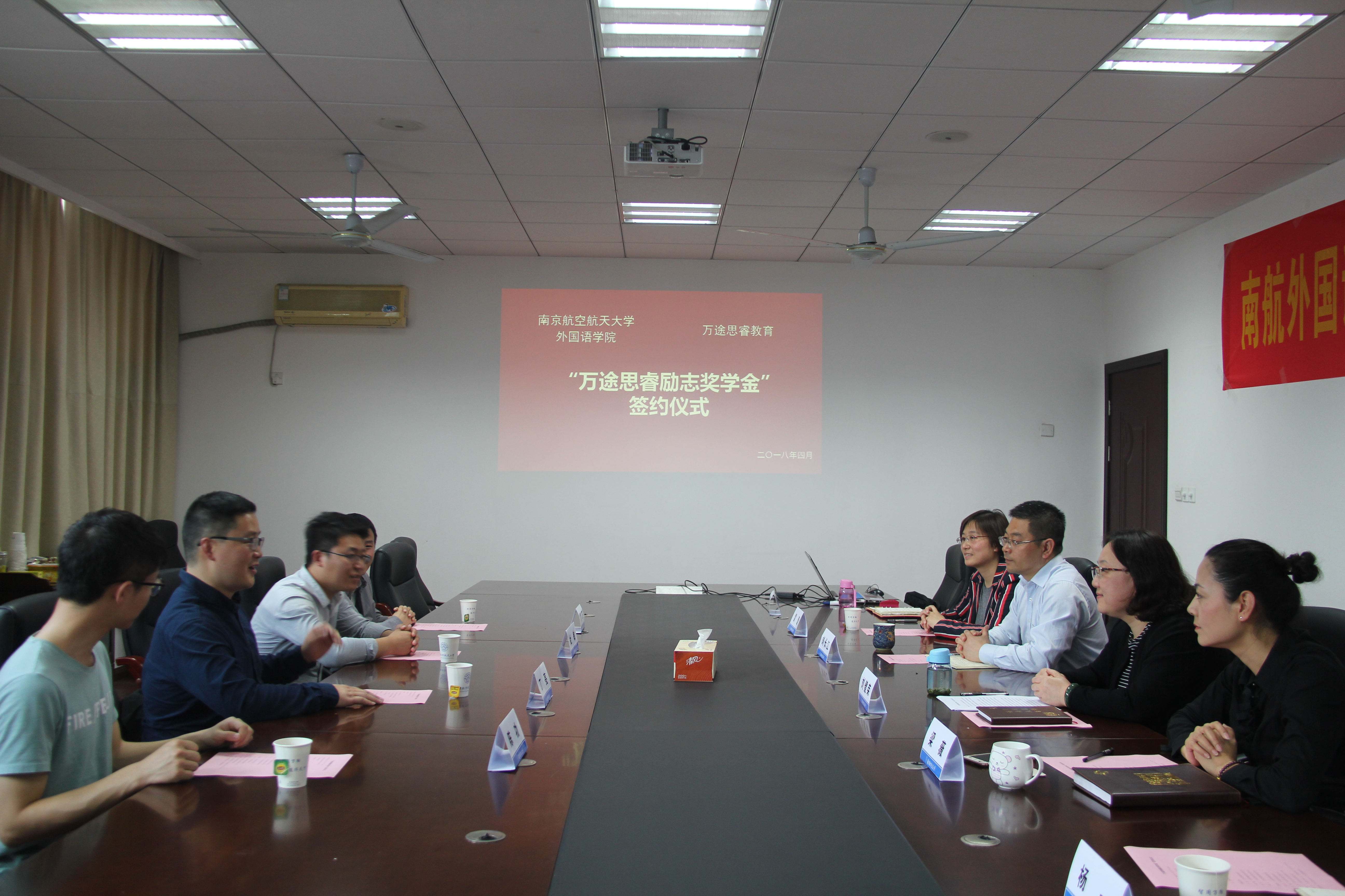 4月3日下午,必威西汉姆联“万途思睿励志奖学金”签约仪式在学院322会议室举行。南航校友、必威西汉姆联06届毕业生万途思睿教育校长丁亮、万途思睿教育分校负责人杜敏、陈功、徐正,必威西汉姆联党委书记刘健荣、副院长刘长江、党委副书记梁薇、校学生处资助管理中心主任雷蕾、必威西汉姆联团委书记杨一、本科生辅导员彭欢、本科生兼职辅导员张秋逸参加了此次签约仪式。