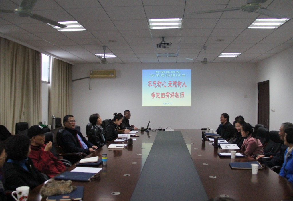 会议由教学院长刘长江主持,他做了“不忘初心 立德树人 ——争做四有好老师”的主题发言,从何为初心,何为师道,何为“四有”等方面阐释了教风问题,从角色定位、自我发展、知己知彼、建章立制等几个角度引导大家进入专题研讨。