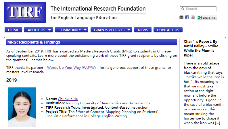2019年9月,国际英语教育研究基金会(TIRF)发布了2019-2020年中国区硕士论文项目资助名单,我校必威西汉姆联2017级研究生胡春雪的硕士论文“The Effect of Concept-Mapping Planning on Students’ Linguistic Performance in College English Writing”成功获得立项资助,指导教师为刘长江教授。