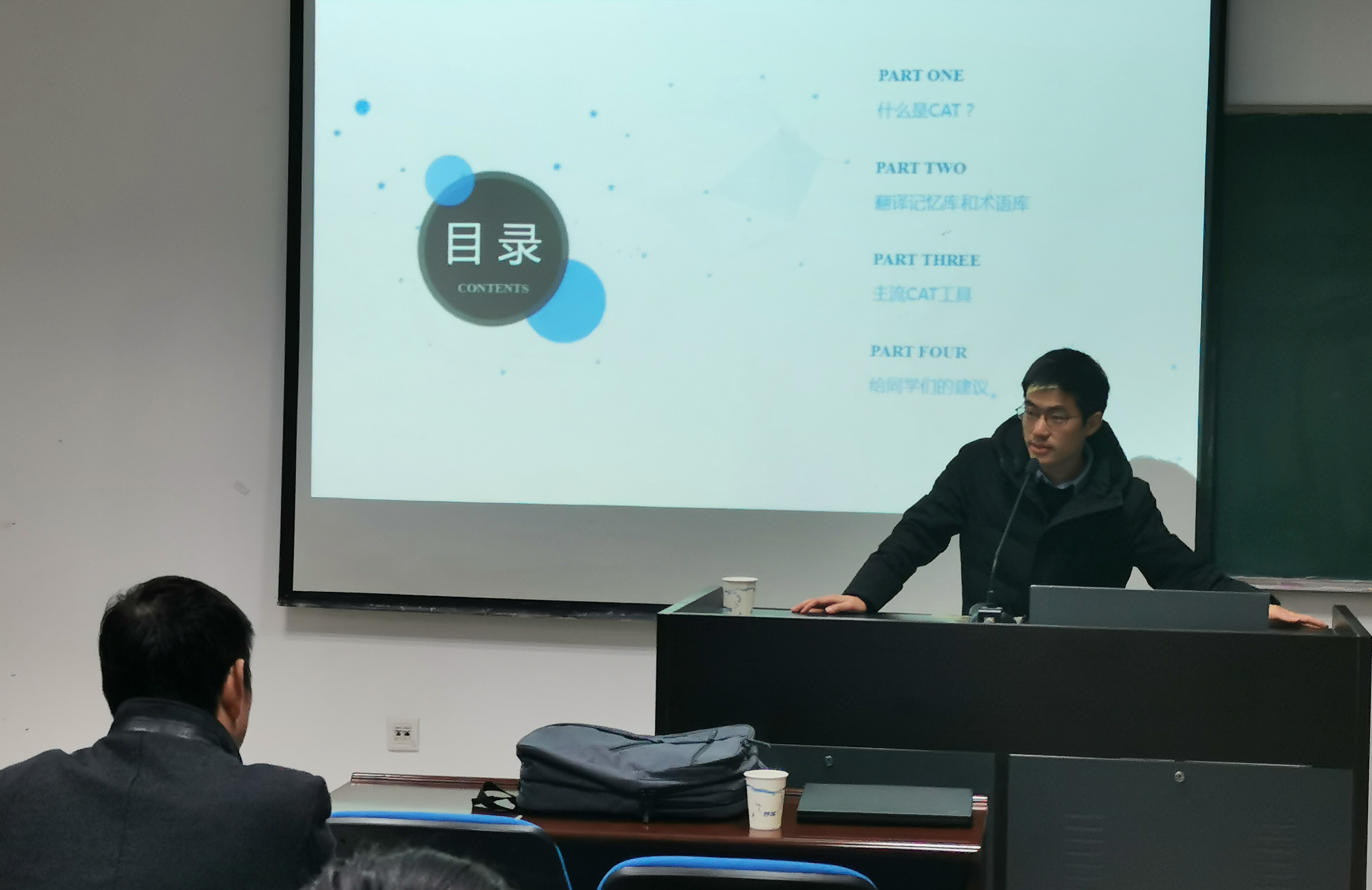 首先,陈世遥老师就计算机辅助翻译(CAT)的相关信息做了系统的介绍。CAT(计算机辅助翻译)不同于MT(机器翻译),前者是以人为主体开展翻译活动,通过借助机器来提高译员翻译的效率,而后者则是以机器为翻译主体,是完全自动化的翻译过程。CAT的核心为翻译记忆库和术语库,通过对翻译过的内容进行记忆和保存,能为后续翻译中类似的句段提供参照和借鉴,而术语库的使用则大大降低了我们在术语查询方面的工作量,从而提高翻译效率。