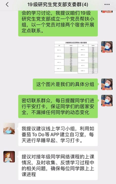 当前,疫情防控将进入全面总攻阶段,研究生同学也面临实习、答辩、求职签约等重要环节,为了帮助同学们顺利开展各项工作,切实帮助同学们解决困难,各年级党支部以党旗引路,充分发挥组织力量,以分专业联系小组、党员对接宿舍等方式,形成了在疫情防控、求职就业、论文答辩、学习科研等方面联络沟通、解决问题的工作模式,让党支部的战斗堡垒作用在疫情防控期间得到充分发挥。