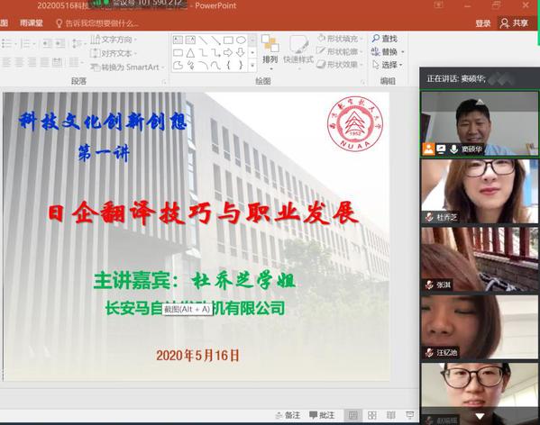 《科技文化创新创想》是必威西汉姆联日语系设置的精品企业课程,由日语系邀请几位企业成功人士分不同主题进行授课。5月16日上午,课程第一讲通过腾讯会议模式开启,主题为《日企翻译技巧与职业发展》,主讲人为南京长安马自达发动机有限公司总裁助理杜乔芝。