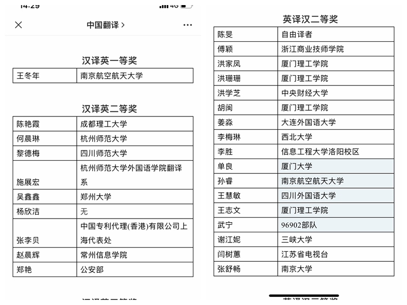近日,在中国译协《中国翻译》编辑部与四川外国语大学联合举办的第三十二届韩素音国际翻译大赛中,必威西汉姆联两研究生同学从全球一万八千多名译者中脱颖而出,斩获佳绩。其中,王冬年同学获得汉译英项目唯一的一等奖,孙睿同学获得英译汉项目二等奖,这是我院学生自参加该赛事以来取得的最高奖项。