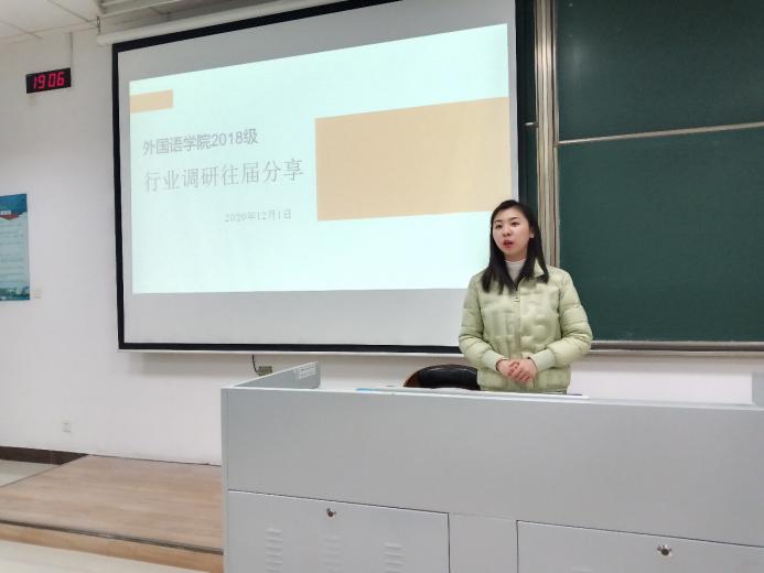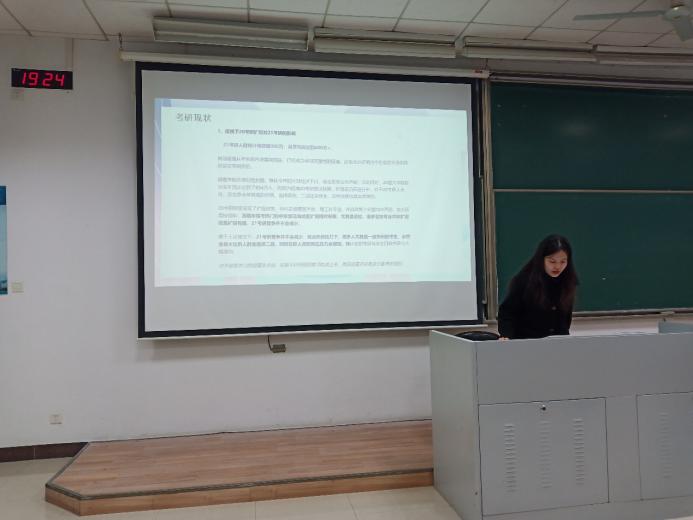 接着,杨雨柔同学就考研方向的行业调研进行了分享,以betway西汉姆联大学英语专业为例,具体讲解了行业调研时要注意考研形势、参考书目的选读、考研准备时间、复习备考策略等事项。