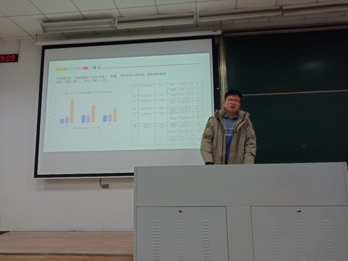 首先,蒋逸伦同学分享了留学调研分析报告,从报告构成、具体分析、优劣势分析以及注意事项四个方面为同学们讲述了申请去英国留学的情况,就院校选择、申请要求、课程设置、毕业走向、学时学费等问题进行了详细解答。