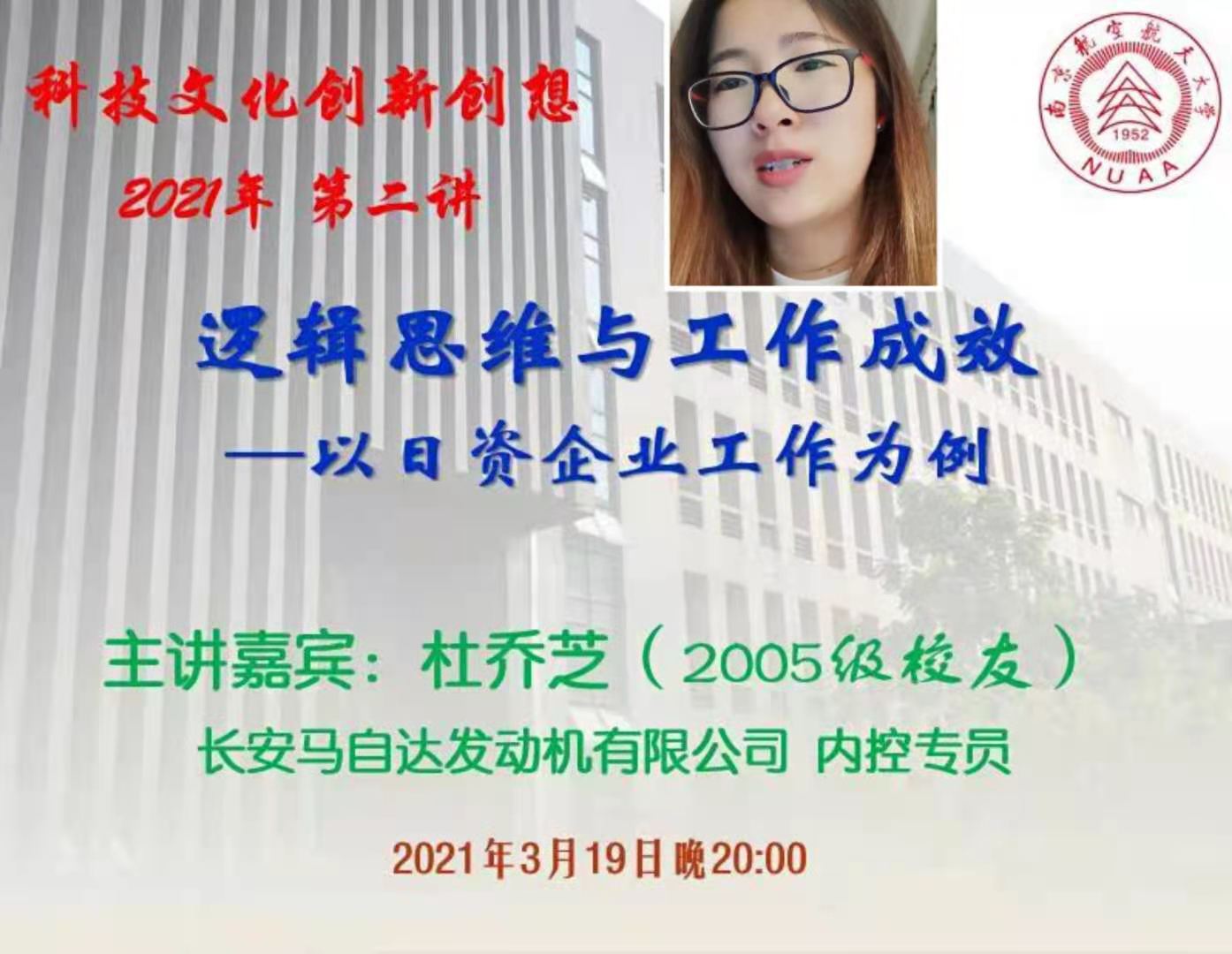 3月19日,必威西汉姆联日语系科技文化创新创想课程第二讲通过腾讯会议模式开启,主题为《逻辑思维与工作成效—以日资企业工作为例》,主讲人为南航2005级校友杜芝乔,曾任南京长安马自达发动机有限公司总裁助理,现任该公司内控专员。