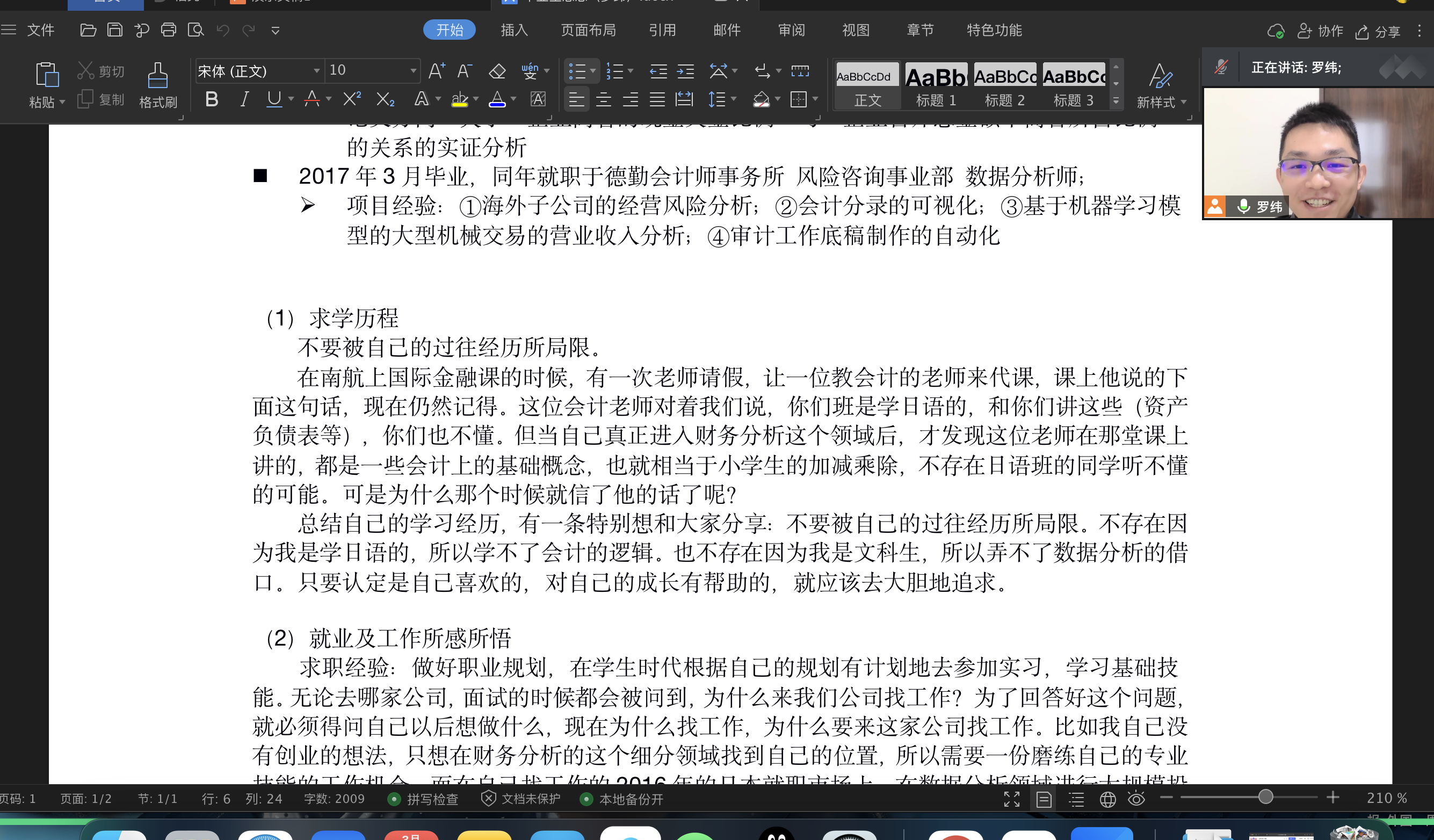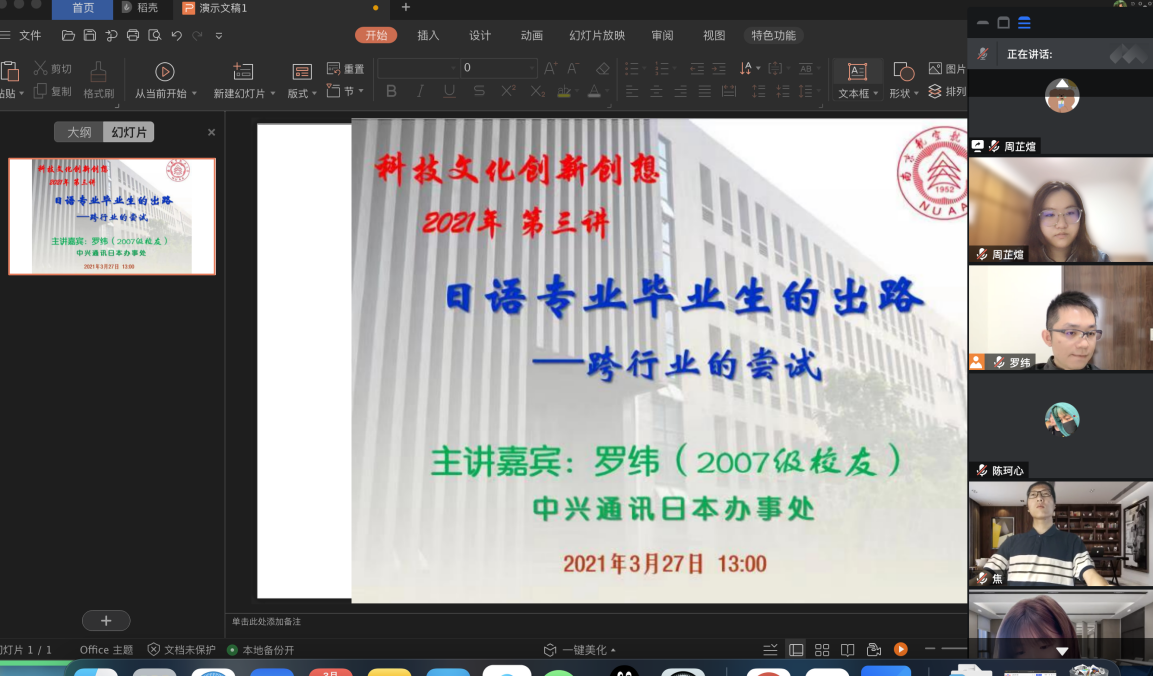 3月27日下午1:00,必威西汉姆联日语系科技文化创新创想课程第三讲通过腾讯会议模式开启,主题为《日语毕业生的出路——跨行业的尝试》,主讲人为07级日语系校友罗纬,日本一桥大学和东京大学双硕士,曾就职于日本德勤会计师事务所,任职风险咨询事业部数据分析师,现就职于中兴通讯日本办事处。