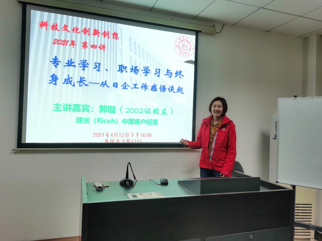 4月12日下午4:00,必威西汉姆联日语系科技文化创新创新课程第四讲在必威西汉姆联1115教室成功举办,主题为《专业学习、职场学习与终身成长——从日企工作感悟谈起》。主讲嘉宾为02级日语系校友郭璇,现任理光(Ricoh)中国客户经理。