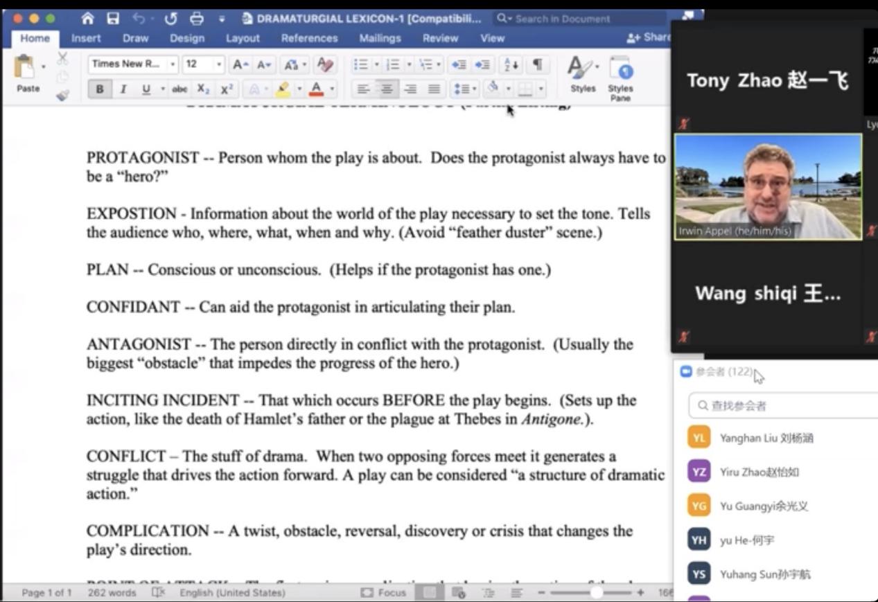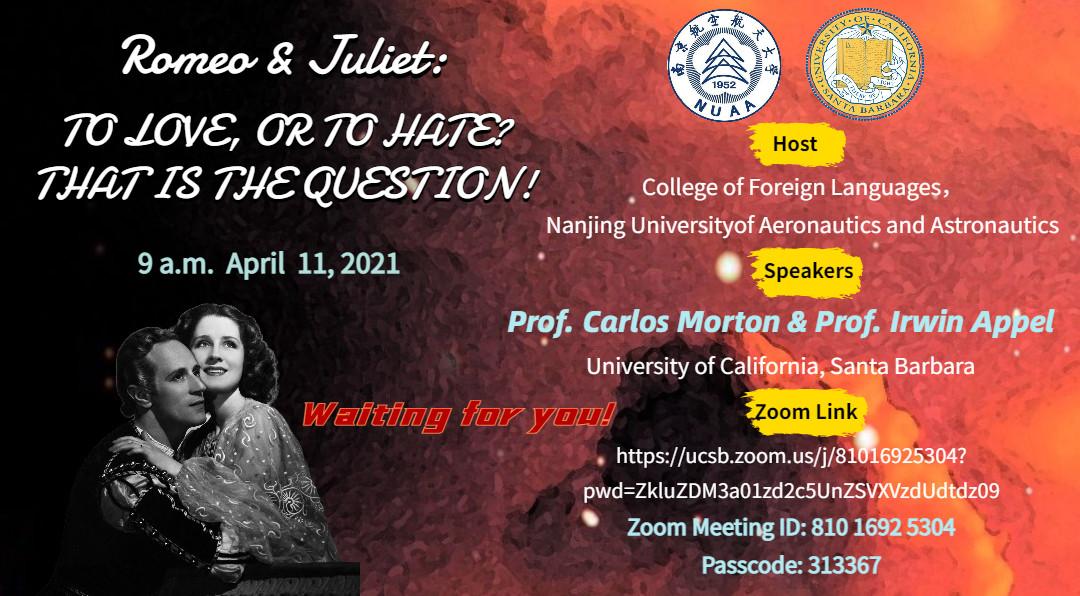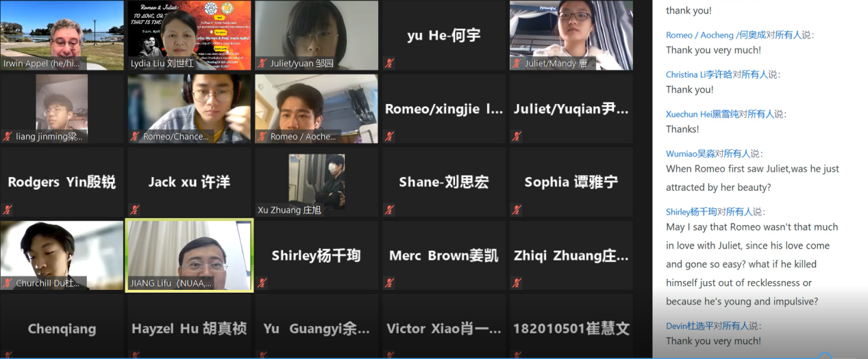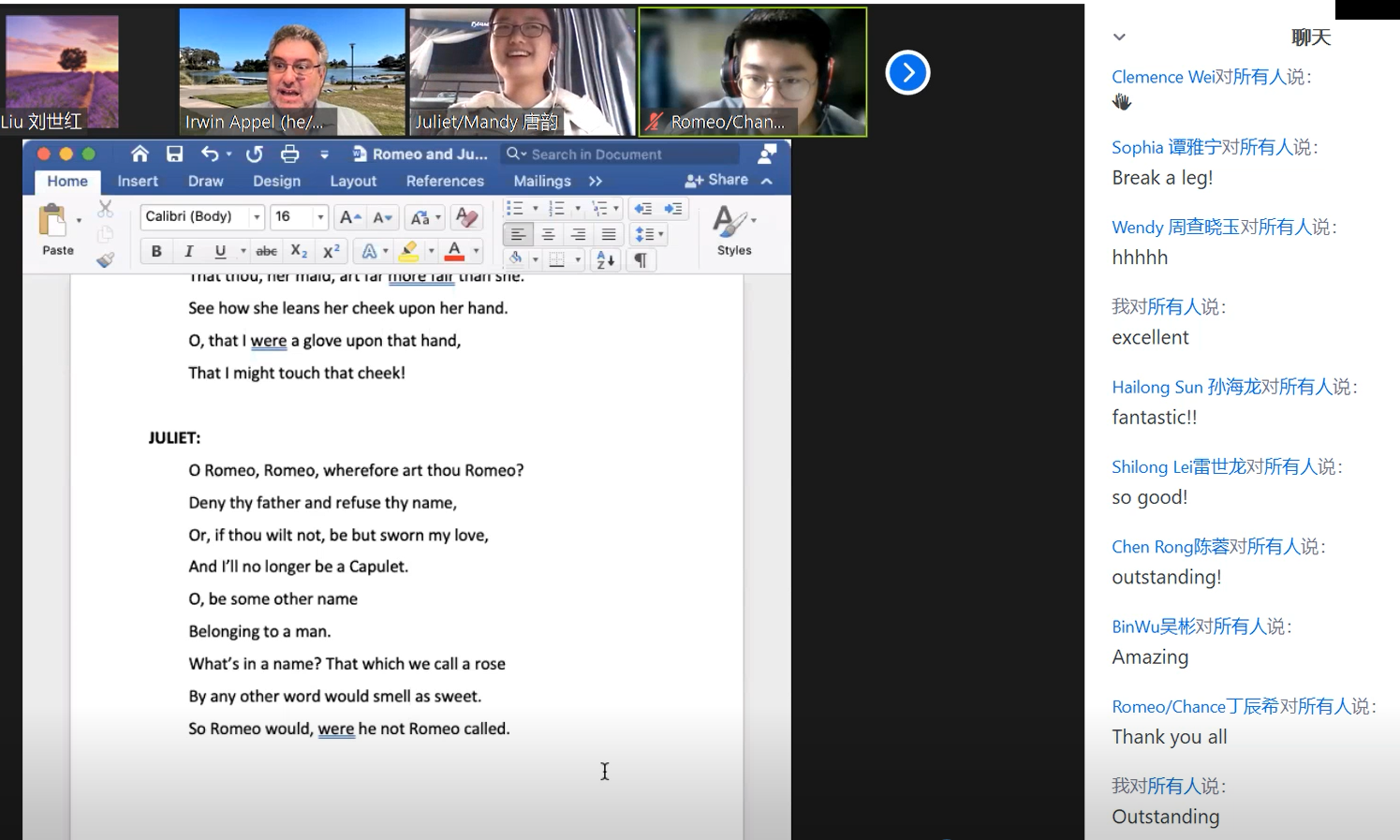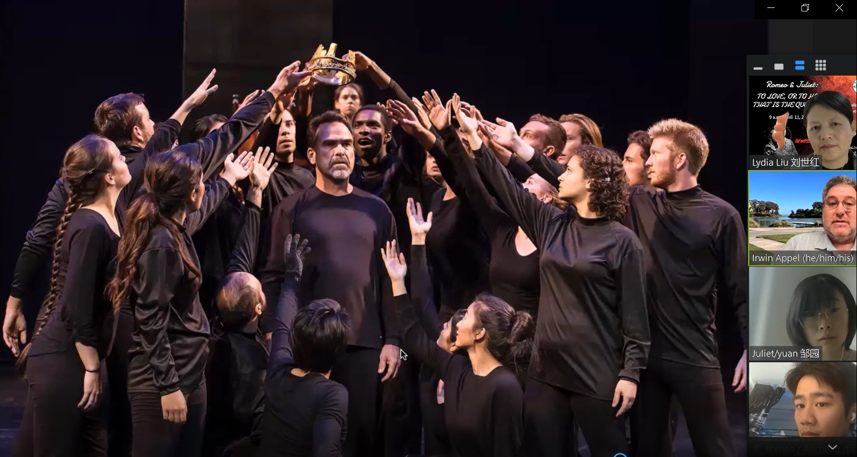 本次讲座共分为两个环节,由必威西汉姆联国际联络中心主任、刘世红副教授主持。在第一环节中,加州大学圣巴巴拉分校戏剧教授Irwin Appel从自己的研究和实践情况出发,和同学们分享了人物角色、人物关系、故事背景、情节设置和台词意义等方面的相关知识。教授还结合《罗密欧与茱丽叶》中的情节介绍了戏剧中的各要素,如主角、情节、反面角色、事件、矛盾冲突、高潮等。随后,教授和同学们针对《罗密欧与茱丽叶》剧情相关的问题进行了热烈讨论,而Irwin Appel教授针对同学们的问题进行了一一解答,向同学们展示了自己的见解。在第二环节中,身为演员的Appel教授通过对比不同背景音乐、变换语气语调,亲自朗诵了《罗密欧与茱丽叶》中的经典台词和独白,并指导同学们对其中的精彩片段进行了演绎和表演。随后,Irwin Appel教授启发同学们围绕莎士比亚戏剧的表达思想以及《罗密欧与茱丽叶》的悲剧内核展开了热烈的讨论,与会的师生们通过会议软件聊天室、或者开麦提问,气氛活跃,互动精彩纷呈。讲座的最后,我院副院长姜礼福老师对讲座进行了总结,高度评价了Irwin Appel教授讲座的学术价值,并邀请Irwin Appel教授未来到我校开展更多更深入的合作交流。