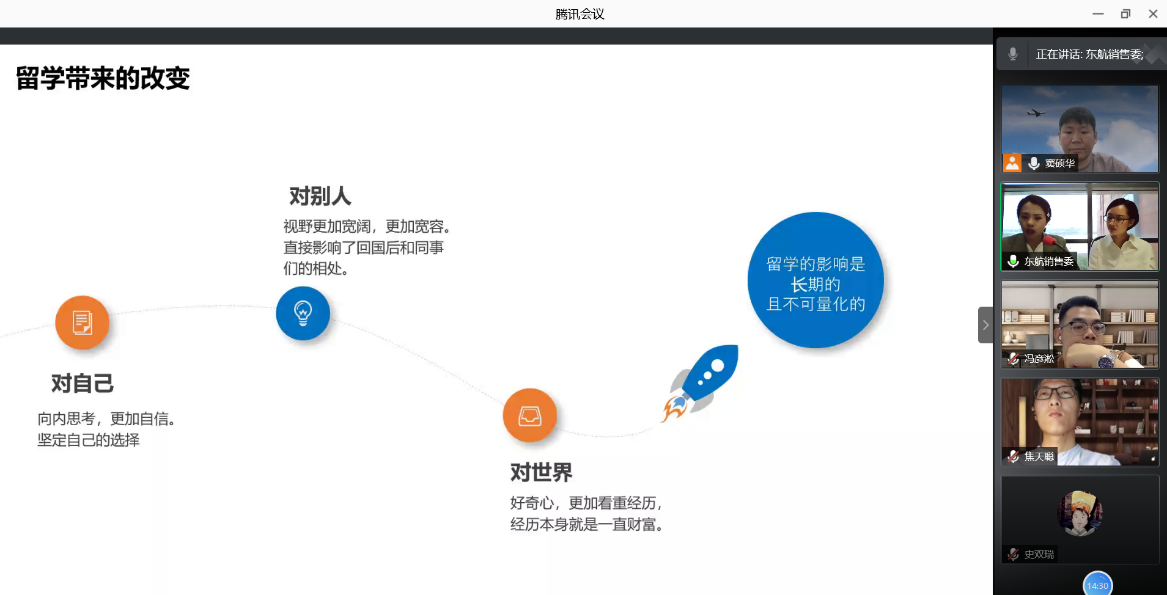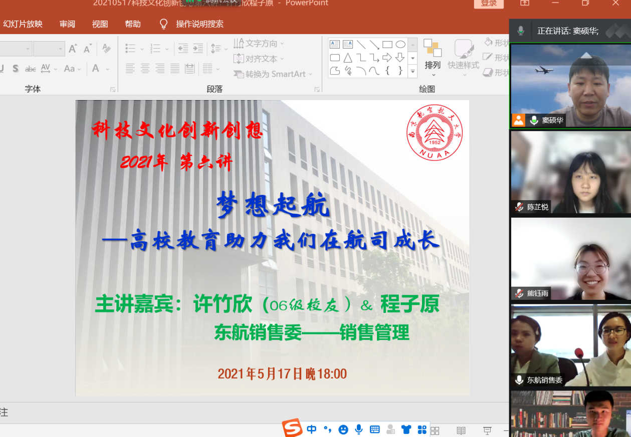 5月17日晚18点,必威西汉姆联日语系《科技文化创新创想》第六讲通过腾讯会议开启,主题为《梦想起航——高校教育助力我们在航司成长》,主讲人为东航销售委的许竹欣和程子原两位优秀代表,其中许竹欣为南航06级校友。