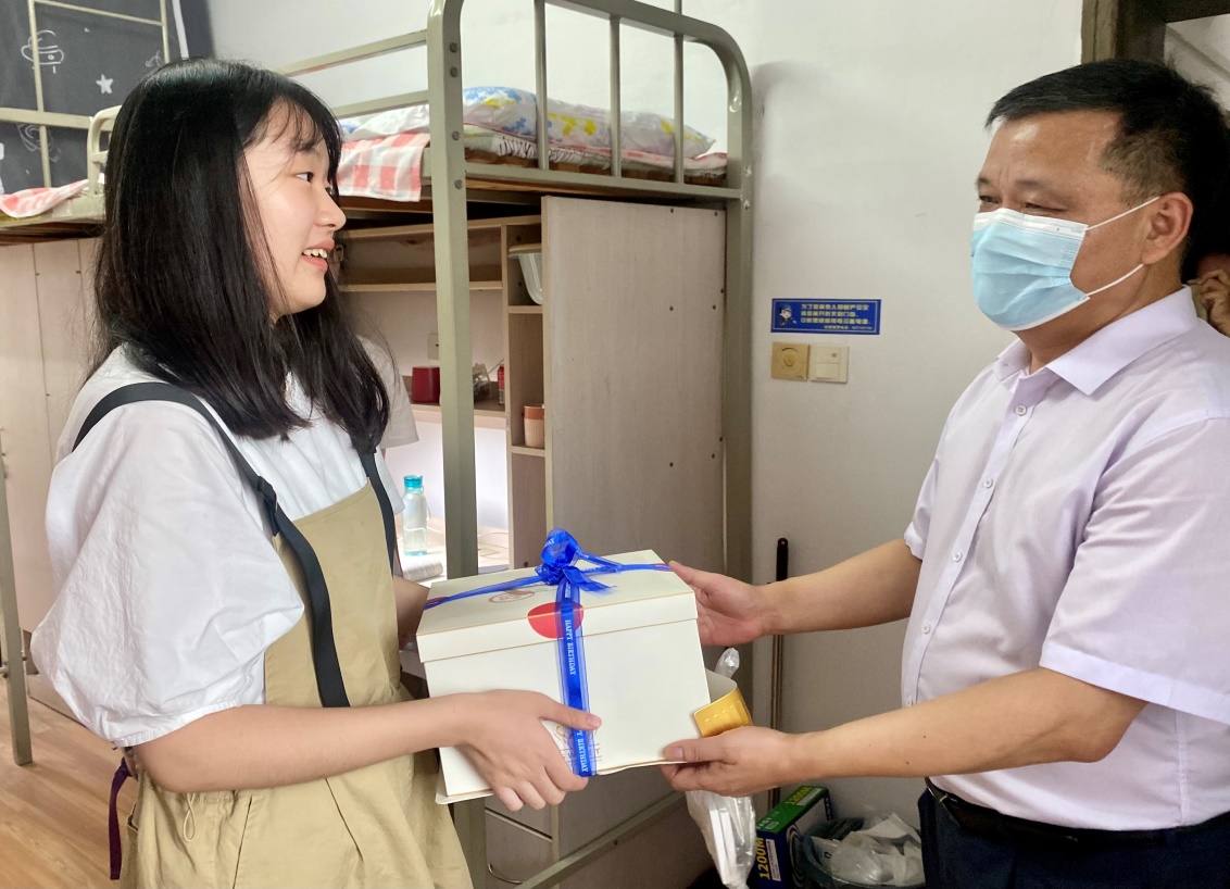 院长一行来到女生宿舍,恰逢一名江苏扬州的女生过生日,学校学院贴心地准备了生日蛋糕和暖心祝福,希望同学能在一进入南航就感受到家一般的温馨和美好。范院长和同学们亲切交流外语学习的方法心得,对于语言学习“听说读写译”的首要原则,举例强调书籍原著阅读的重要性,通过朗读大声阅读去培养同学们的语感,使同学们倍受启发。