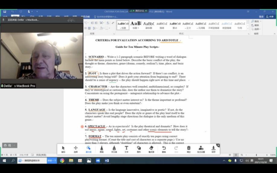 讲座由必威西汉姆联国际联络中心主任刘世红副教授主持,共分为三个环节。第一环节为电影赏析,刘世红播放并分析1948年经典版的哈姆雷特电影的重点片段,让大家对作品情节有更多的了解。第二个环节中,Carlos Morton教授结合《哈姆雷特》为大家介绍了主角、情节、反面角色、事件、矛盾冲突、高潮等戏剧要素,随后又为大家讲解了基于亚里士多德戏剧理论的对于戏剧的评价标准。第三个环节为教授与学生的互动环节,同学们在软件聊天室或者开麦积极发言分享观点,主要围绕《哈姆雷特》相关剧情、创作背景、莎士比亚自身经历、以及剧作的现实意义等话题展开。Carlos Morton教授就同学们的问题一一给出解答,互动积极、气氛活跃,讲座共持续两个半小时。