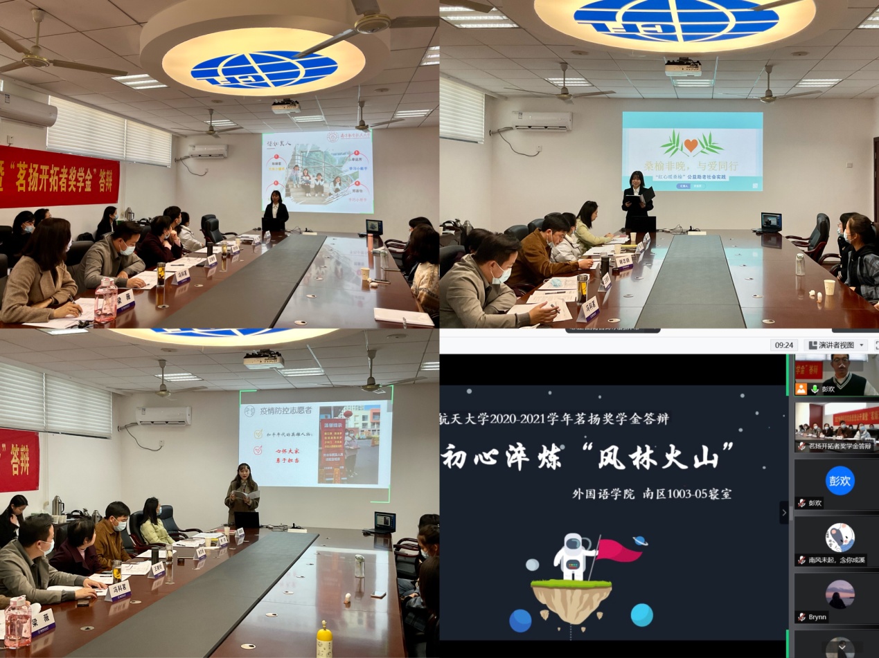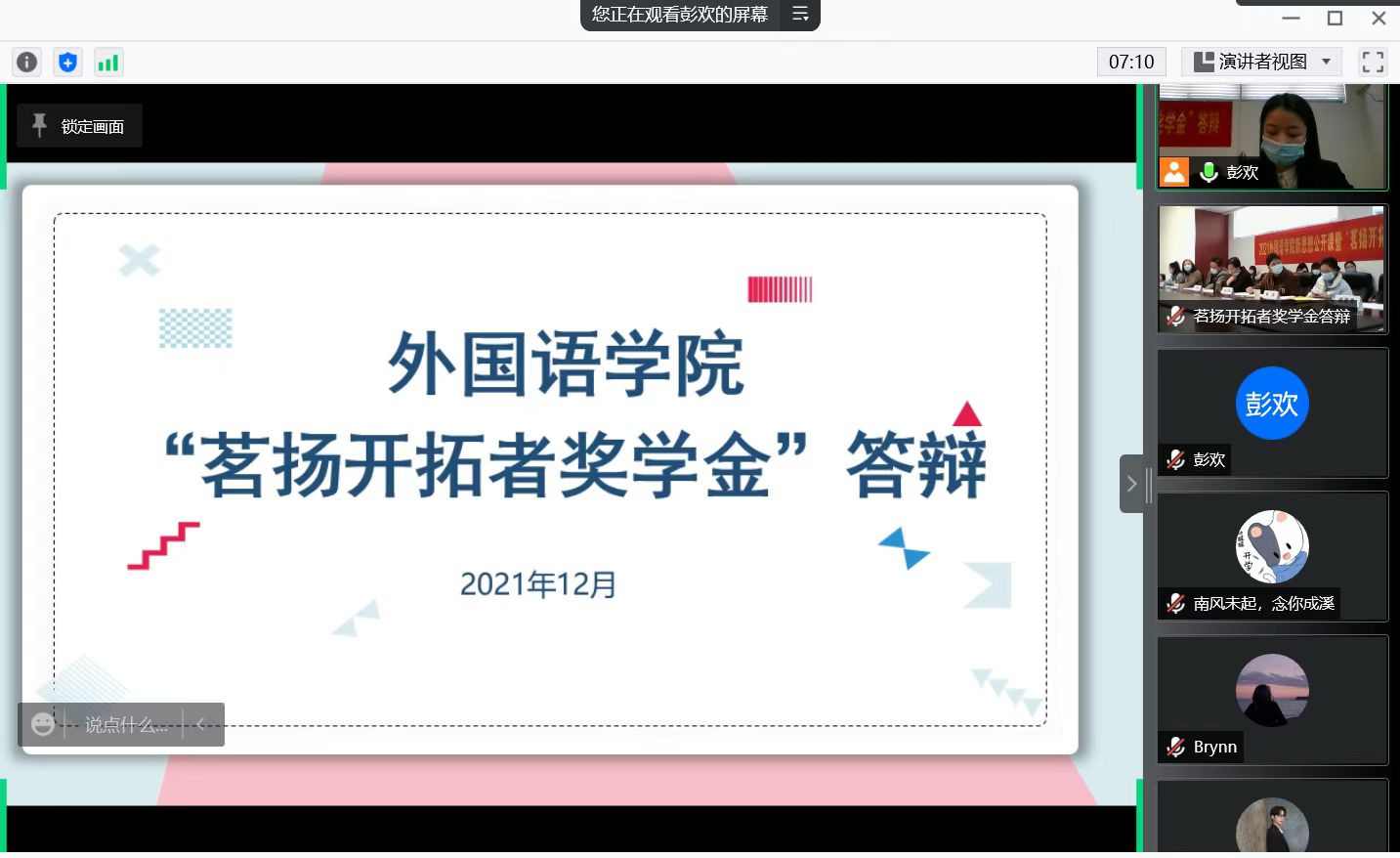 12月2日下午,必威西汉姆联举办了新思想公开课暨“茗扬开拓者奖学金”答辩会。“茗扬开拓者奖学金”资助人杰出院友冯科茗、谢志扬、必威西汉姆联党委副书记梁薇、英语系副教授王晓玲、院团委书记李萍、本科生辅导员盛嘉贤、本科生辅导员彭欢出席答辩会。本次答辩会由上届“茗扬开拓者奖学金”一等奖获得者肖依雪主持,全体本科生通过腾讯会议进行线上观摩学习。