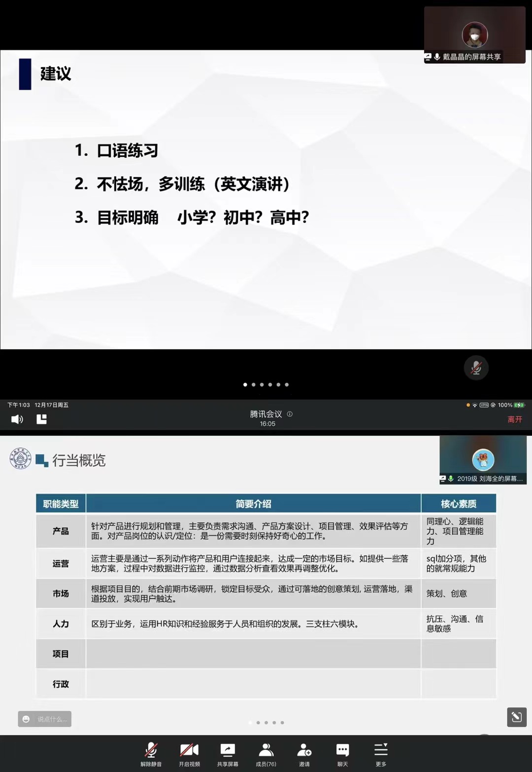 12月17日,必威西汉姆联面向2021级研究生开展了“职”引未来,共语研途线上公开月讲评,本次月讲评由研究生兼职辅导员李艳红主持召开,2021级全体同学参加,旨在为研一同学职业规划提供建议与指导。