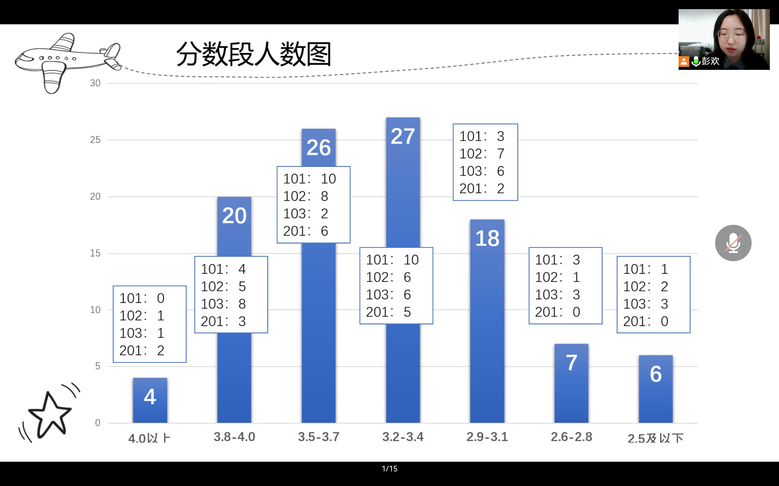 会议伊始,曹文清对2021级大一上学期成绩进行了总结分析。通过对各班级之间平均绩点、绩点分段、各科成绩等方面的比较,旨在帮助同学们找差距、补短板。之后,曹文清将2021级与2019级本科生大一上学期成绩进行了对比,指出2021级新生仍有进步空间。最后,她对成绩突出的同学予以表扬,并鼓励全体同学保持学习的动力与热情,尤其在疫情期间,更要坚持规律的作息,保持学习状态,认真完成老师发布的任务,与国家共克时艰。