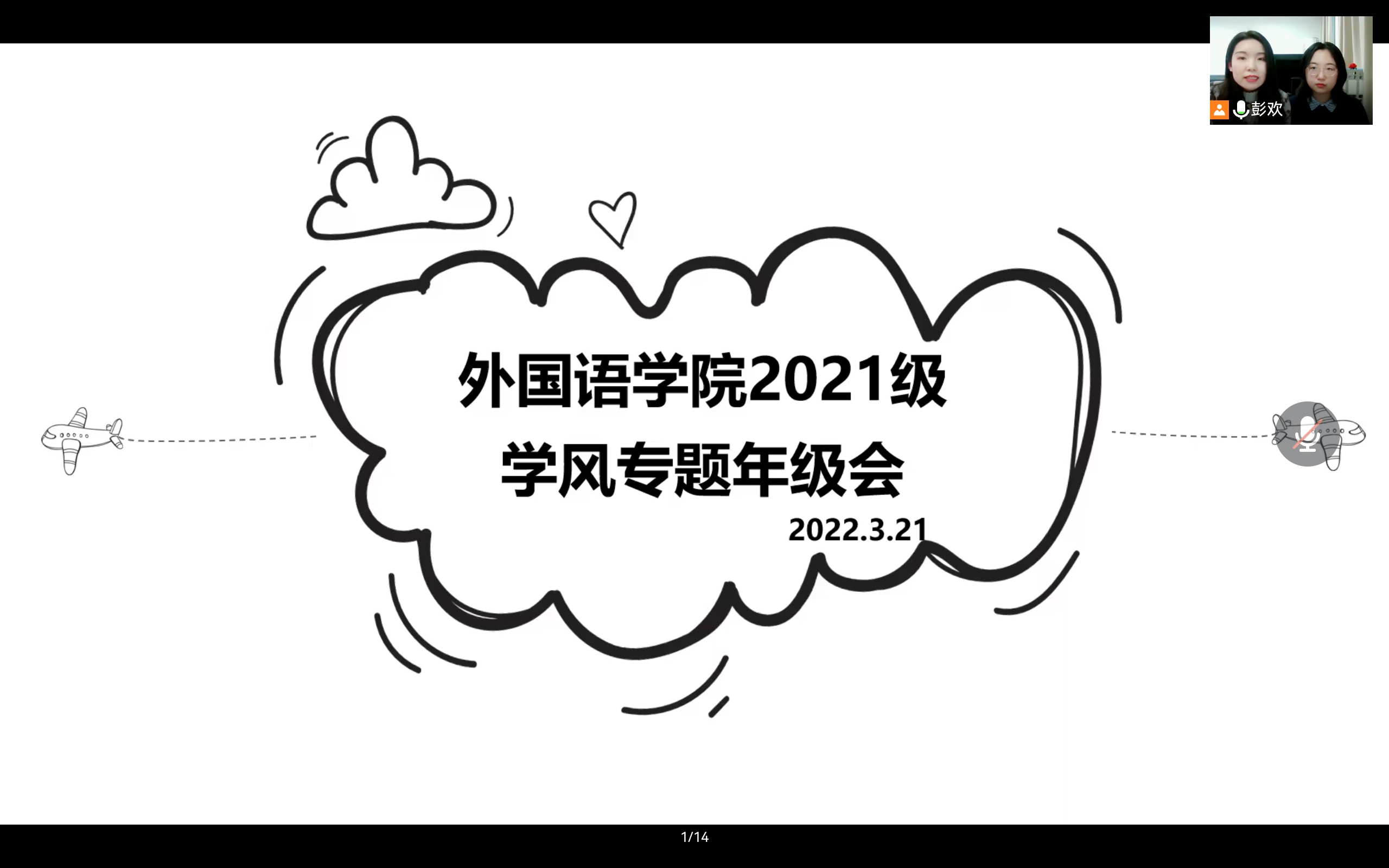 为调动同学们的学习积极性,营造更好的学习氛围,回顾总结上学期的学业成绩,3月21日下午,必威西汉姆联2021级全体本科生于线上开展学风专题年级会暨“学业攀登计划”启动仪式,会议由辅导员彭欢和兼职辅导员曹文清共同主持。