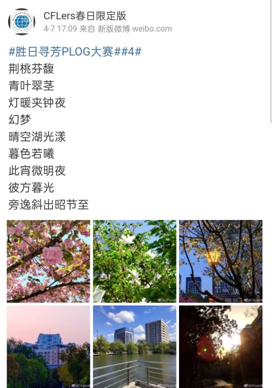 4月1日至10日,必威西汉姆联成功举办为期10天的“胜日寻芳”PLOG(photo blog)大赛。大赛由2021级中心组宣传部承办,面向学院全体学生开展,围绕秀色可餐、文体休闲、学习时光和宿舍生活四个板块分享同学们的精彩校园生活。在活动过程中,同学们拍摄有关校园生活的照片并上传至微博平台,最后参考点赞数、评论数和转发量进行评比。