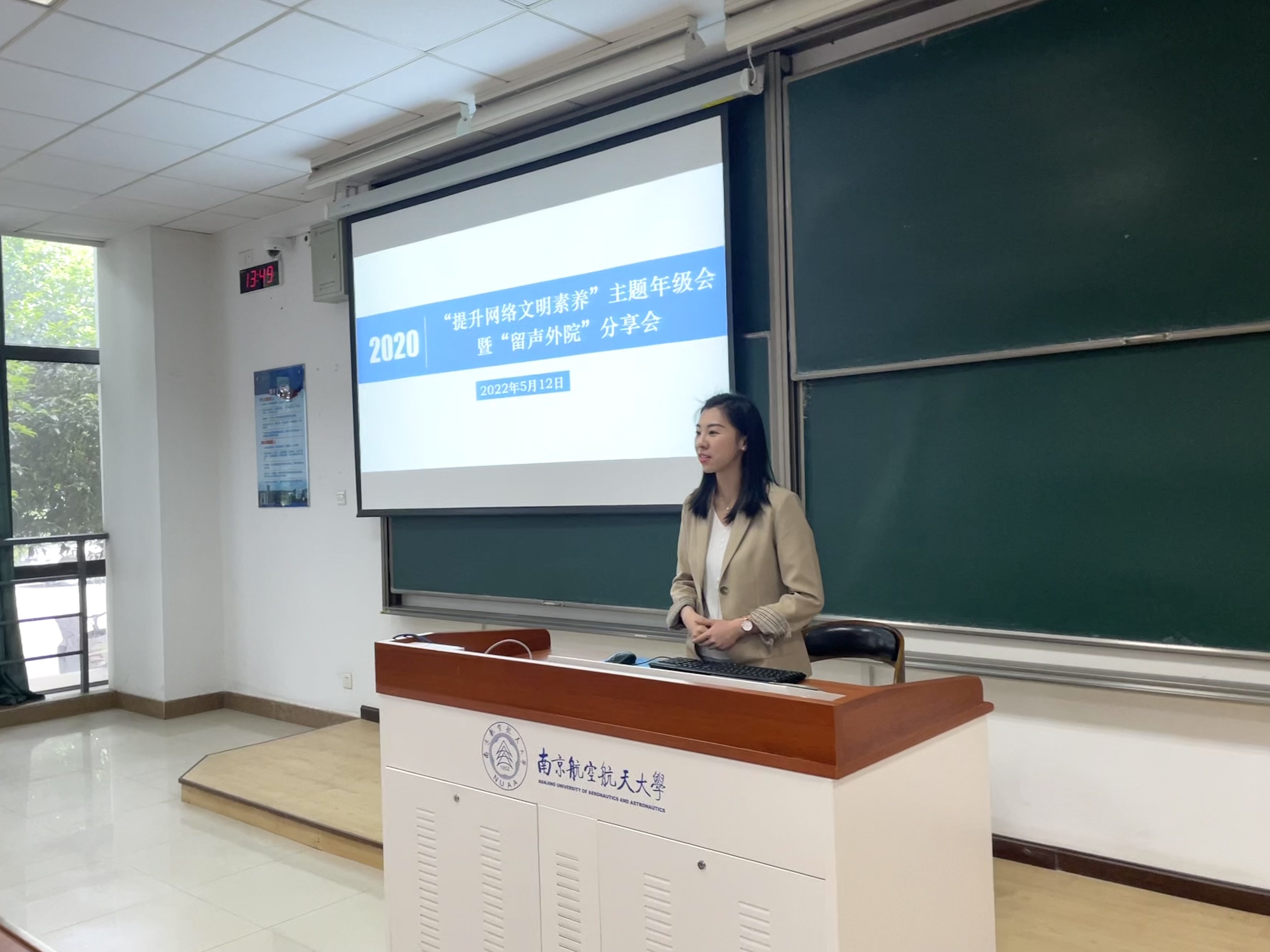 为了营造清朗的网络环境、提升学生的网络文明素质,帮助同学们更好地立足当下、规划未来,5月12日,必威西汉姆联在D3102教室开展了“提升网络文明素养”主题年级会暨“留声外院”分享会。年级会由辅导员盛嘉贤主持,毕业班学生甘雨珊和张舒作经验分享,2020级全体同学参与。
