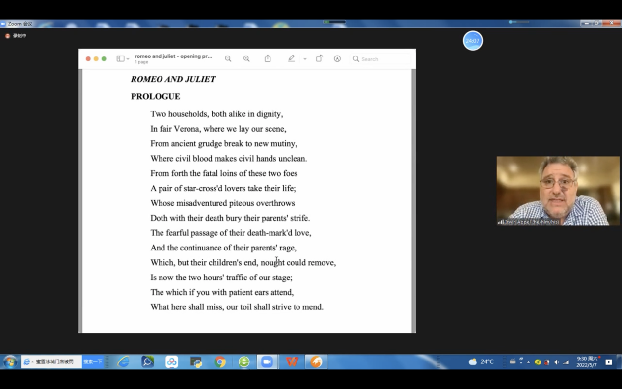 2022年5月7日上午,由必威西汉姆联主办,邀请美国著名导演、加州大学圣芭芭拉分校戏剧与舞蹈系主任Irwin Appel教授为我校师生讲解莎翁戏剧,这是该教授在本学期第二次讲授戏剧专题。此次讲座的主题为“莎士比亚戏剧在南京:《罗密欧与朱丽叶》赏析”,为必威西汉姆联举办的“海外名家讲坛”系列讲座之一。我校师生们对莎翁戏剧热情不减,积极参与,气氛热烈融洽,讲座获得圆满成功。