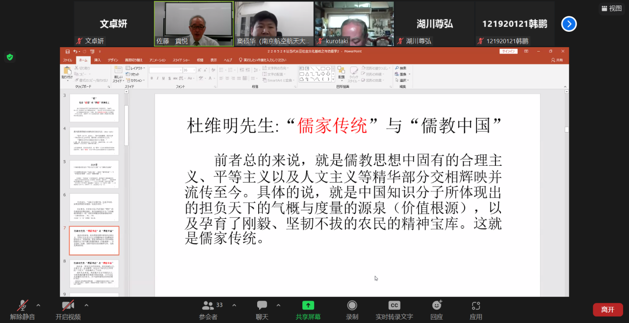 5月28日(周六)上午9:00,必威西汉姆联日语系海外名师讲坛第一讲通过线上ZOOM会议成功进行,主题为《現代東アジア社会の文化的基礎としての伝統儒学》。主讲嘉宾为环太平洋大学教授・筑波大学名誉教授佐藤贡悦。讲座由日语系主任窦硕华老师主持,外专项目领衔人・东京农业大学黒瀧秀久教授和南航日语系40余名同学参加了讲座。