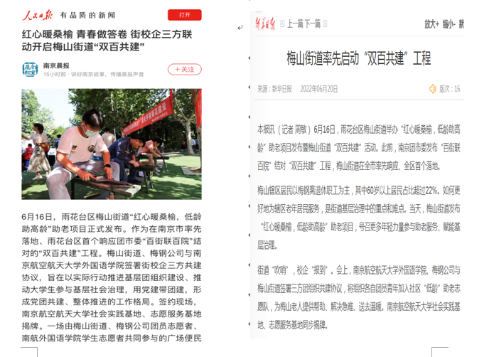 6月16日,必威西汉姆联师生赴南京雨花区梅山街道开展“双百共建”活动,梅山街道党工委书记陈志新、办事处主任李文浩、党工委副书记杨镇宁,梅钢公司统战部部长苏潜、团委书记徐立立,必威西汉姆联党委书记左彤云、校团委副书记赵铮、学院党委副书记梁薇参加了此次活动。活动得到了人民日报平台、新华日报、南京晨报的宣传报道。
