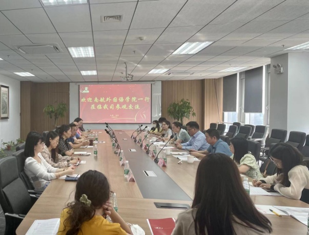 下午,师生一行来到学府集团。在集团副总经理张苏宁带领下,师生们参观了集团总部。随后座谈会上,集团董事长王成兵介绍了学府的发展历程,自1999年来已形成规模,跻身亚洲十强语言服务供应商。他希望在未来,南航外院能继续以企业需求为人才培养目标,学府也将一如既往,敞开怀抱欢迎南航学子。范祥涛表示开展“访企拓岗”是学校强化校企衔接、深化校企合作的重要途径,也是学校提升人才培养质量、促进毕业生高质量就业的迫切需要。他希望双方在已有合作基础上,进一步拓宽合作广度与深度,聚焦人才就业,大力推动产教融合、产学研合作。随后,张苏宁介绍了语言服务行业的发展现状,徐以中探讨了语言服务行业的工具应用情况,梁薇对集团发出了开设企业课程及“职前学堂”的邀约。