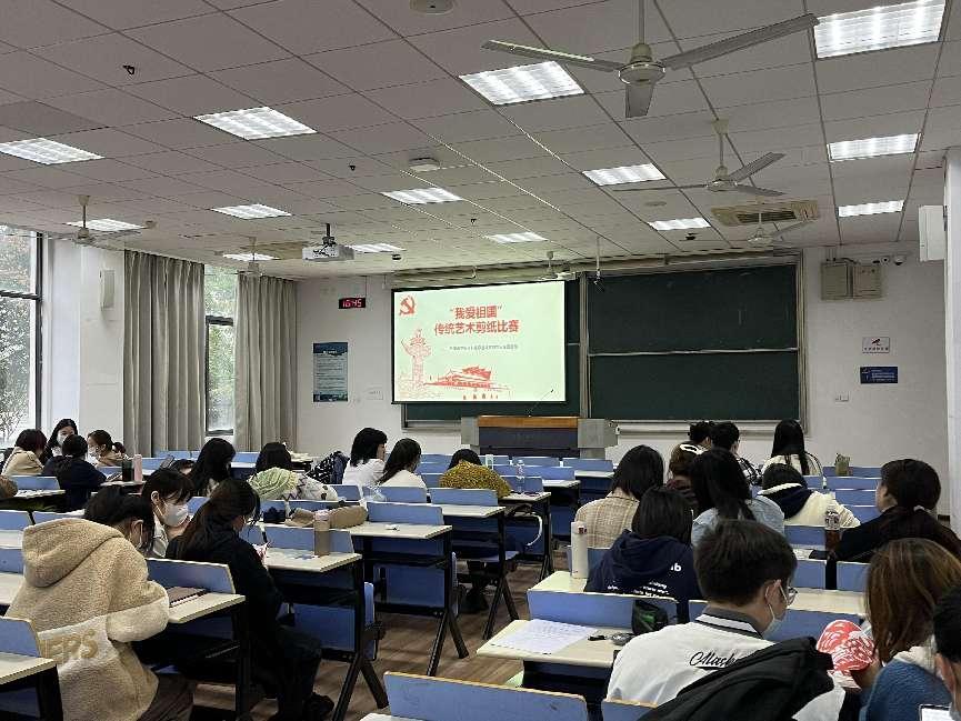 活动伊始,所有同学自发组成3-4人小组,派代表领取剪纸材料、垫板、剪刀和刻刀等工具。剪纸材料以祝福祖国为主题,图样精美,有刻着“盛世中华”字样的红色彩旗、刻着“我爱祖国”的爱心图案、刻着“爱我中华”的秀美河山……一张张红色的宣纸上饱含着对祖国的深情祝福。随后,每组自行进行组内分工,有的同学负责大致轮廓的裁剪、有的同学负责“精雕细琢”……制作过程中,每组同学都感受到了不小的挑战,剪纸图案精美、纹路细致,需要十足的耐心和精细的手工能力。活动现场气氛热烈、笑声与讨论声不断,大家互相鼓励、交流心得,尽情感受着剪纸这项传统文化的魅力和乐趣。