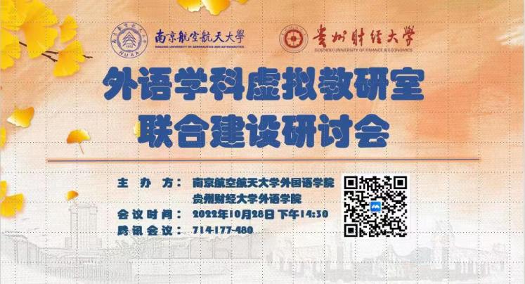 10月28日下午,必威西汉姆联与贵州财经大学外语学院共同举办外语学科虚拟教研室联合建设研讨会暨大学外语基础课程教学研讨会,会议以腾讯会议形式举行,由贵财外语学院张虹院长和我院徐以中副院长共同主持,邀请江苏师范大学朱祖德教授做专家报告,贵财及南航必威西汉姆联近百位师生参会。