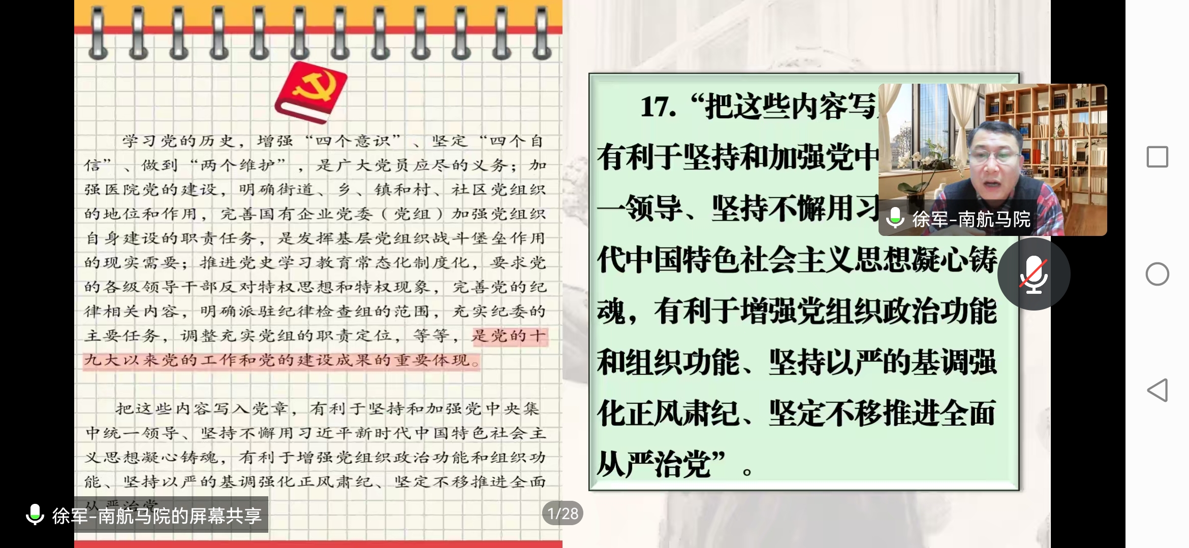 课上,徐军从“为什么要修改党章”“党章修改了哪些地方”切入,对新修改的党章进行解读。他指出,党章是党的总章程,对坚持党的全面领导、推进全面从严治党、加强党的建设具有根本性的规范和指导作用,鼓励大家更加自觉地学习党章、遵守党章、贯彻党章、维护党章。