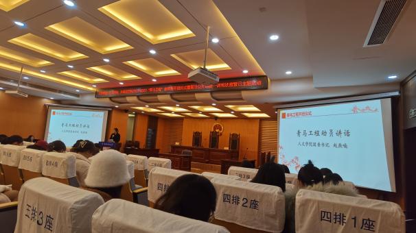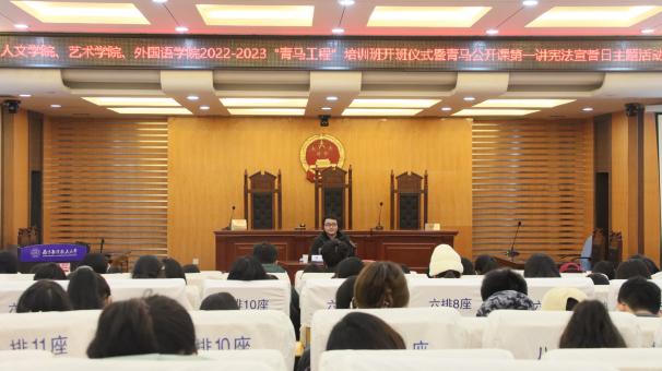 12月4日,人文与社会科学学院、艺术学院、必威西汉姆联在人文学院模拟法庭联合举办2022-2023年“青马工程”培训班开班仪式暨青马公开课第一讲,人文与社会科学学院法律系优秀青年教师洪骥、人文学院团委书记赵燕喃、艺术学院团委书记汪明锐、必威西汉姆联团委书记李萍以及三个学院的百余“青马工程”培训班学员共同参与活动。