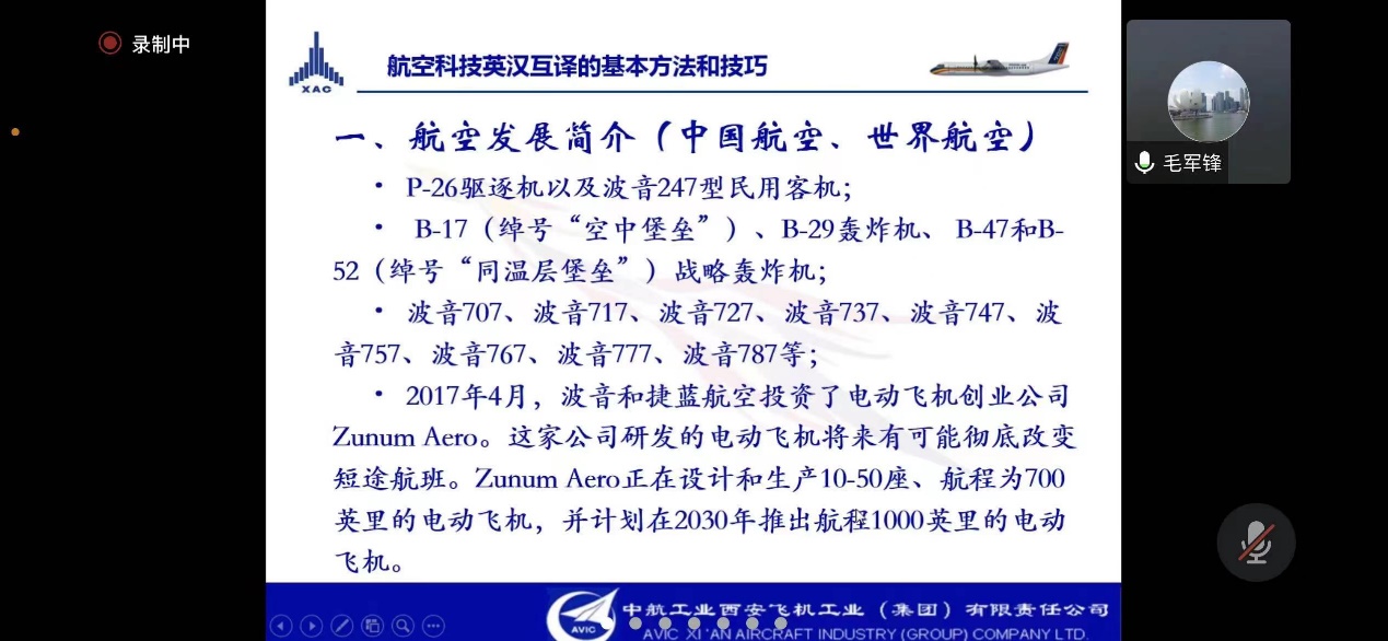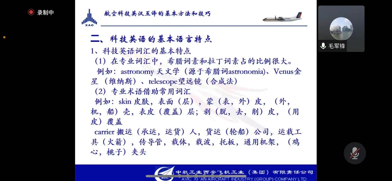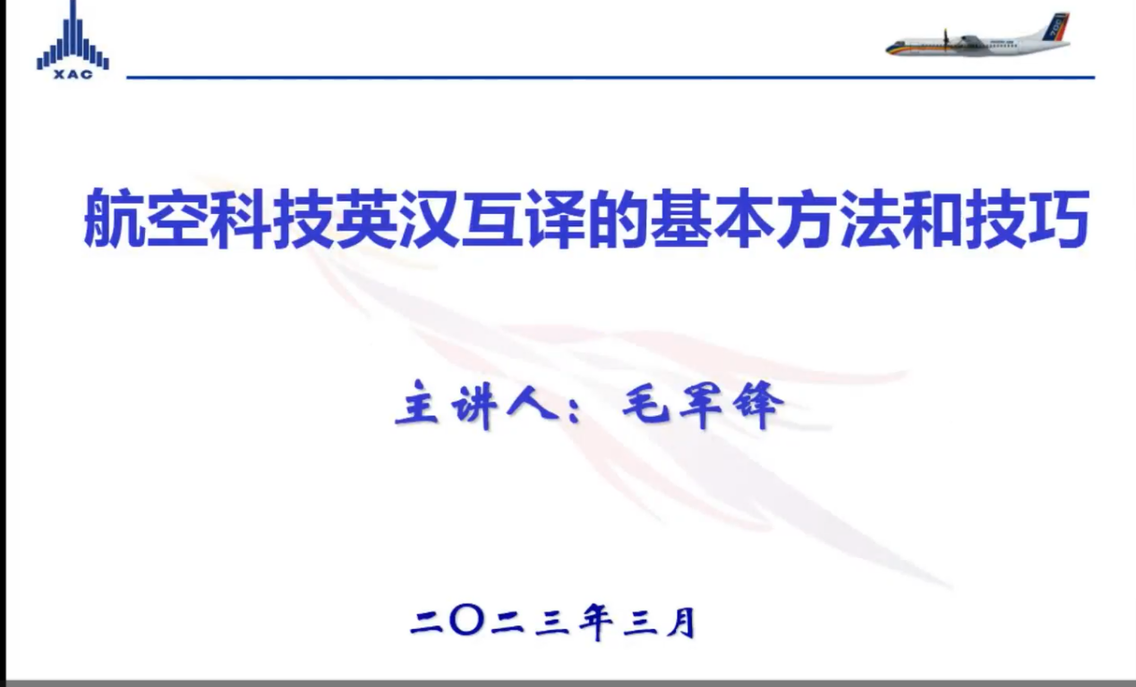 2023年3月3日晚,南航必威西汉姆联MTI教育中心邀请了知名企业导师毛军锋译审给2022级研究生带来行业翻译实训的第一堂课。毛军锋现任中国航空工业集团有限责任公司翻译系列高级专业技术职务任职资格评审委员会委员、中国翻译协会专家会员、中国航空学会会员。本次课程,毛老师给大家带来了航空科技英汉互译的基本方法和技巧系列课程,侧重分析和探讨了航空科技汉译英的翻译策略。