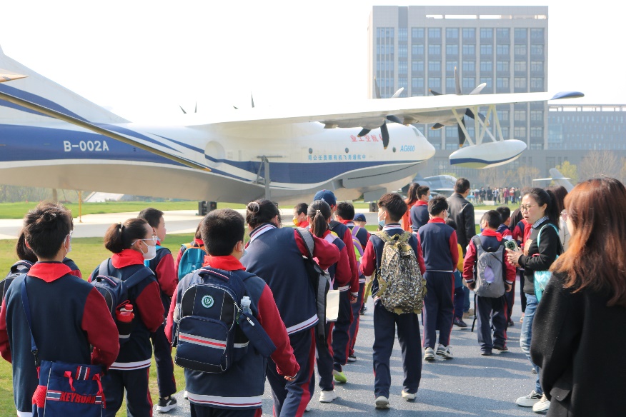 在志愿者细致的讲解中,同学们了解到了荣获国家科学技术进步一等奖的K-8基础教练机、发射太阳同步轨道和极地轨道各种应用卫星的主要运载工具长征四号运载火箭、大型特种多用途民用飞机水陆两栖飞机AG600等十多种航空航天器,通过近距离观察众多大型航空航天飞行器,了解这些大国重器背后的故事,加深了对我国航空航天科技事业发展成就的认识。在自由交流环节,同学们惊叹于我国航空航天事业的飞速发展,并积极提问,热烈讨论,志愿者们对同学们的提问一一耐心解答,并引导鼓励同学们励志笃学,长大后投身航空航天事业,报效祖国。