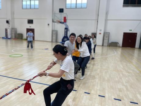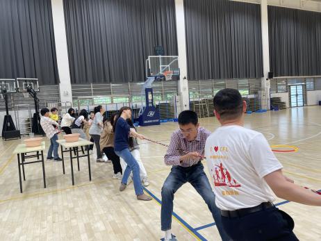 热场项目--师生拔河友谊赛充分激发了大家的运动热情,两边参赛队员团结一致,师生力量拧成一股绳,运动场上奋勇争先。