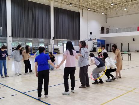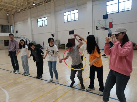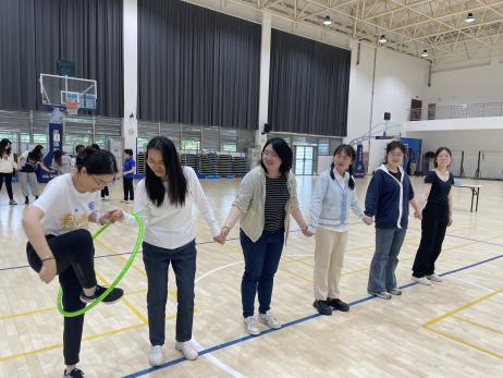“智传呼啦圈”项目比拼时,每队师生手拉手站成一排,呼啦圈依次循环传递,直至全组完成,期间手不能松开,用时最短的队伍获得胜利。小小的呼啦圈,调动了全体师生的运动细胞,选手们在运动中逐渐热情高涨。