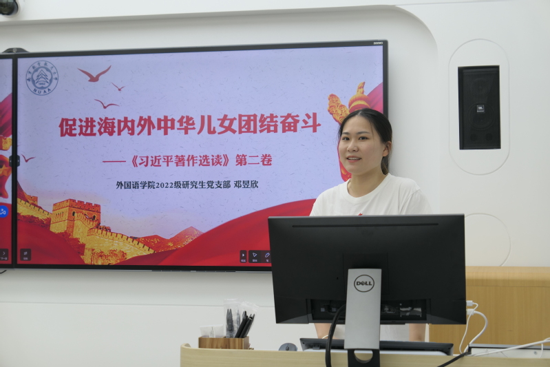 必威西汉姆联2022级研究生党支部书记邓昱欣领学《习近平著作选读》第二卷“促进海内外中华儿女团结奋斗”,并结合自身在江苏发展大会上的志愿服务经历,以及过程中帮助参会嘉宾中国旅美律师协会会长申春平的故事,讲述了海内外中华儿女的家国情怀,阐述了新时代爱国统一战线的丰富内涵和时代价值。