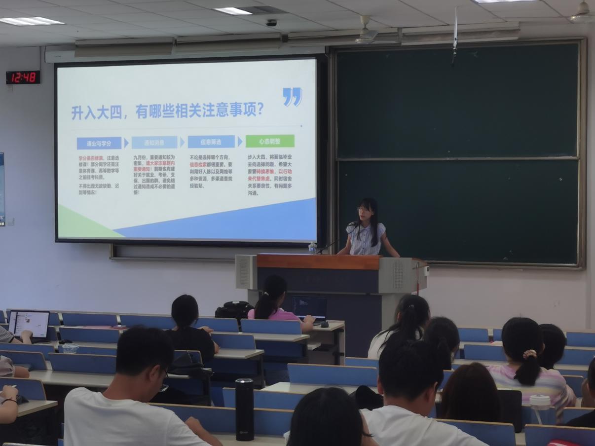 首先,辅导员赵瑜瑶大致介绍了近6年来必威西汉姆联本科生的升学率与就业情况,引导同学们要理性分析考研与就业形势,合理定位。之后,强调升入大四后,同学们要注意学分是否修够,多关注年级群内重要消息通知,并注意心态调整等。