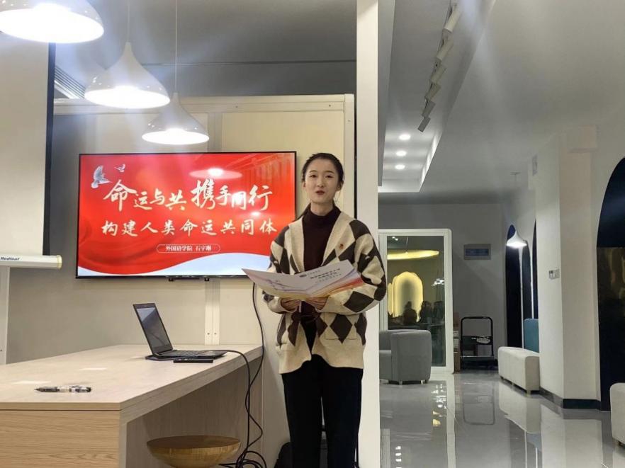 大二团支书石宇琳首先以《命运与共,携手同行——共建人类命运共同体》为题的团课分享。她以一段“卫星眼中人类命运共同体”的小视频引入主题,深入阐述了全球人类命运紧密相连、休戚与共的共同体观念。她从人类命运共同体的四个内涵——国际权利观、共同利益观、可持续发展观和全球治理观的角度分别举例,深入浅出的讲解,使参会同学对人类命运共同体有了更深刻的理解。随后,石宇琳同学联系必威西汉姆联的“Mr.China”实践团队以及模拟联合国项目,提出了自己对外语青年在了解参与国际事务、推动人类命运共同体中应当发挥积极作用的观点。