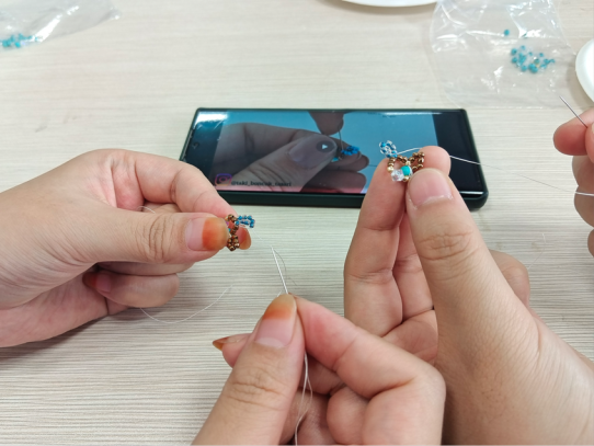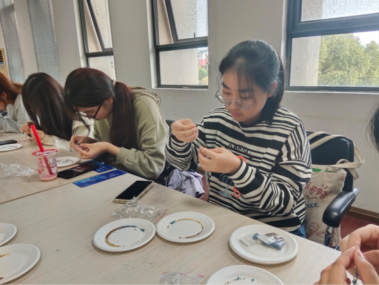 串一曲欢乐颂,串一个同心圆。活动前期,由手工坊里的小老师们耐心地指导大家串珠方法。从刚开始的生疏和笨拙,到后来的娴熟和自如,大家有说有笑,或热心帮忙,或认真观摩,一派欢乐忙碌的景象。一颗颗流光溢彩的珠子正如我们每个独特的个体,渐渐团结组合在一起,闪耀出更加璀璨的光芒。