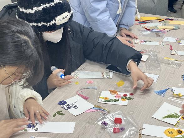 最后,两位老师和同学们共同用植物标本制作了独一无二的书签。书签样式各不相同,但都体现了制作者对文学阅读的热情与创造力和对生活的美好愿景。书签制作完成后,师生互赠书签,同时寄予对方祝愿与期待,留下一份暖冬中的美好回忆,为活动画上了完美的句号。