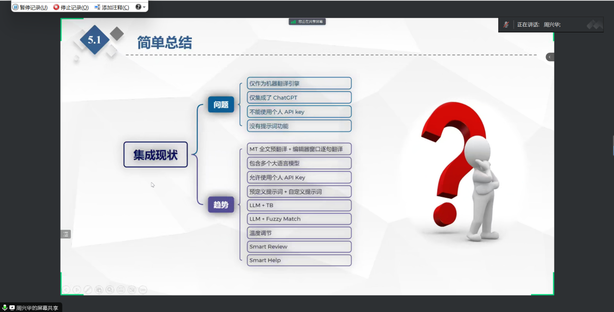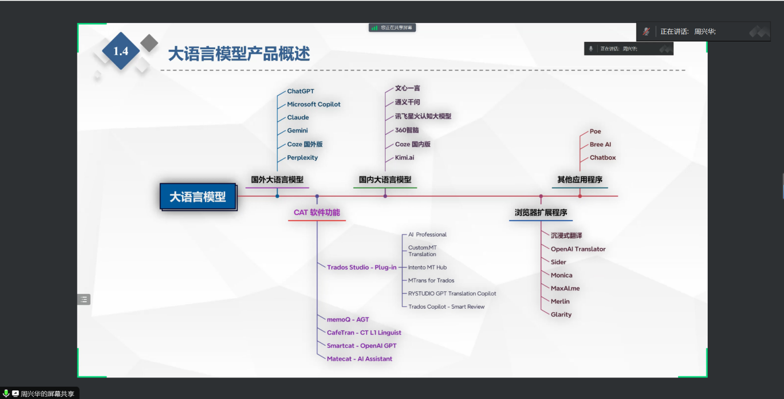 如今,人工智能的时代大势引发了深刻的技术革命、教育变革和数据革命,同时翻译技术也成为了翻译教学和实践中不可分割的部分,进一步推动了语言服务行业和高校教育的创新变革,促进了技术与人的和谐共生。为提升语言服务行业各方对翻译技术的认识和应用能力,加强语言服务人才的技术素养,加速语言技术成果的高效转化,2024年4月1日晚,南航必威西汉姆联MTI教育中心邀请了翻译技术专家周兴华老师给2023级研究生带来了极具前沿特色的一堂翻译技术课。本次课程,周老师给大家带来了大语言模型与CAT软件的集成及实践应用系列课程,侧重分析和探讨了其应用优势与应用场景。