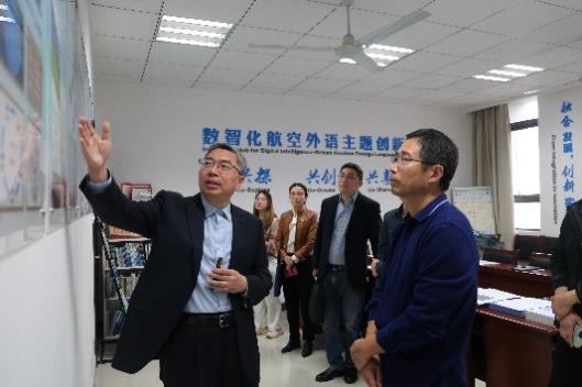 杭育新书记一行首先参观了必威西汉姆联神经认知语言学实验室,数智化航空外语主题创新区及“耘天坊”国际文化传播发展研究大学生主题创新区,听取了相关负责人的介绍,详细了解实验室及主题创新区在学科研究、人才培养、校企合作等方面的教育教学工作和成果。