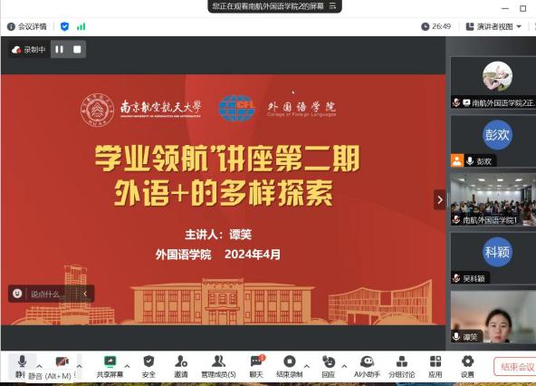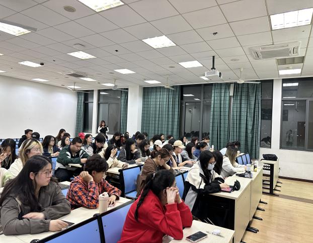 谭笑首先分享了自身的学习工作的经历。自2015年至2018年在南航取得硕士学位后,在2018年至2023年远赴美国亚利桑那州立大学读博,现于杜克大学担任讲师一职。在南航学习期间,谭笑参与了模拟联合国、外研社写作比赛和联合国实习项目,并自学第二外语、考取了上海中高级口译证书。谭笑强调参加该类活动对英语学习的重要帮助,结合自身经历表示模拟联合国活动对英语写作有重大提升作用,参加写作比赛通过集训等方式可以提高读说写的素养与能力。其次,谭笑分享了更多国际化的学习资源,鼓励同学们积极参加如外语写作教学与研究国际研讨会等学术会议。