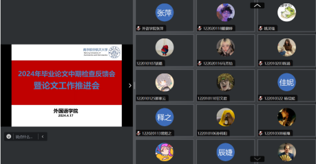 4月17日下午,必威西汉姆联组织在线召开2024届本科毕业论文中期检查反馈会暨论文工作推进会。学院领导、中期检查工作组督导、英、日语系主任、教学办主任、论文指导老师和全体毕业生共100多名师生参加了会议,徐以中副院长主持会议。