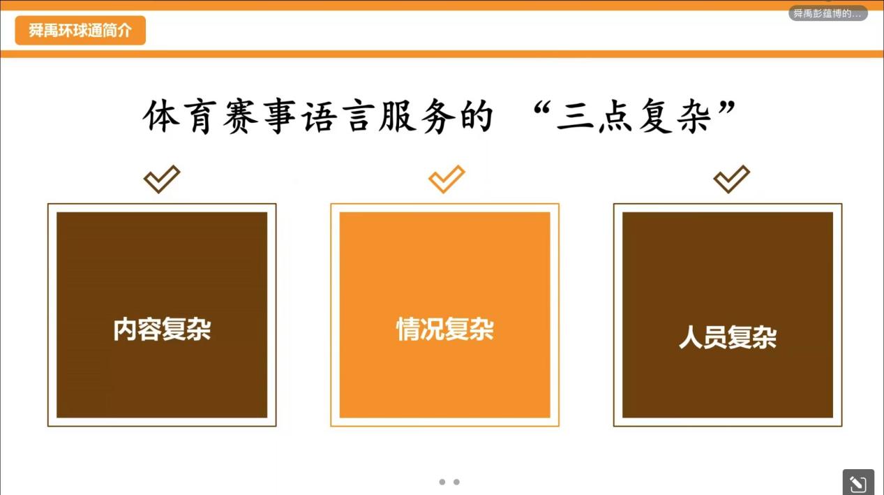 在讲座中,彭经理从客户,译员和项目经理三个角度,系统分析了体育赛事语言服务中各个方面的需求,他指出项目经理需要考虑到所需口译服务的场次数,举行发布会的标准和专业口译服务的形式,需要为不同的项目逐一制定语言服务方案,做好赛时口译管理,成本把控和风险预测和应对。此外,彭经理还细致讲解了赛时口译服务的各个环节,从会前的准备到会中的观察与监听,再到会后的跟进和总结。彭经理指出体育赛事语言服务的“三点复杂”——内容复杂、情况复杂和人员复杂。