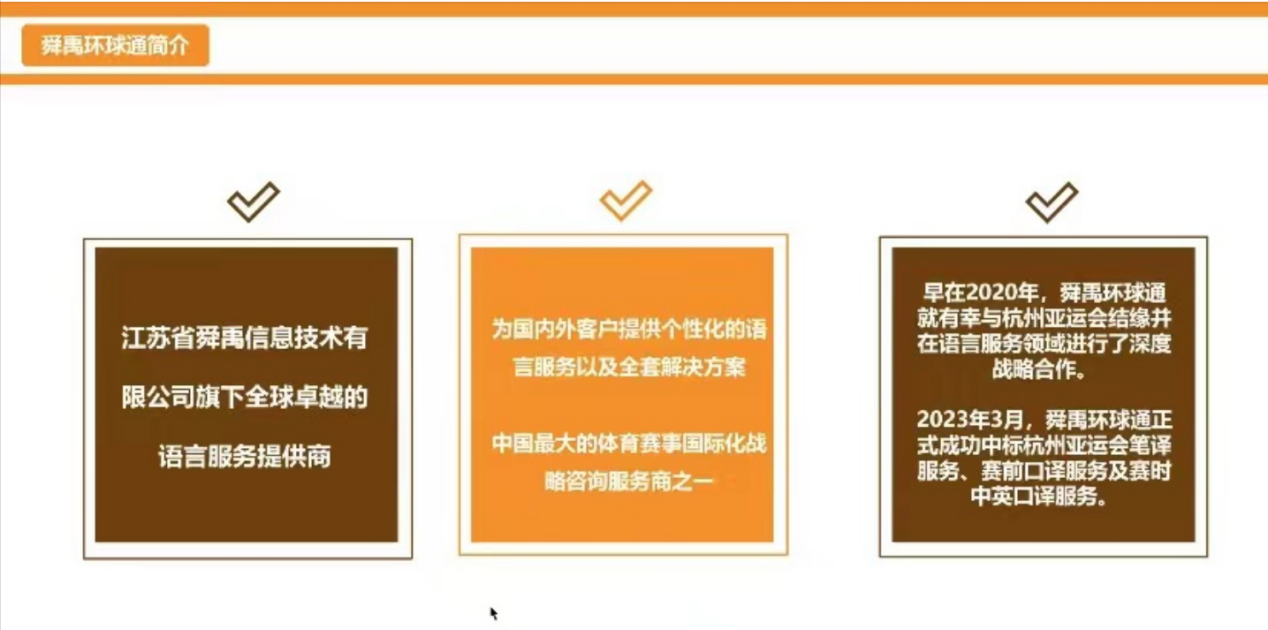 2024年5月20日晚,南航必威西汉姆联MTI教育中心邀请了江苏舜禹信息技术有限公司市场运营与口译服务部主管彭蕴博给同学们带来了“基于公示语翻译项目的MTI学生实践能力培养”讲座第二讲。彭经理以杭州亚运会为线索展开,展示了优质语言服务如何助力亚运盛会的成功举办。