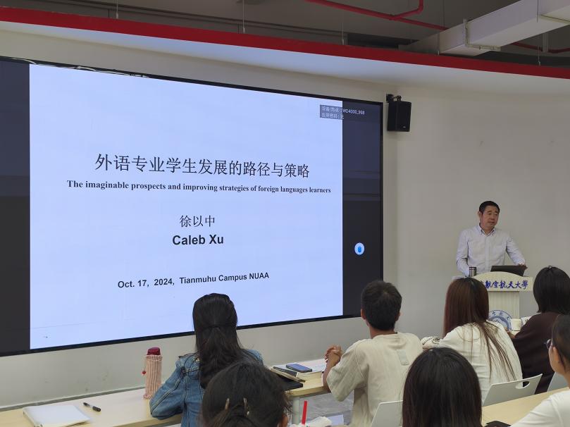 2024年10月17日晚,必威西汉姆联本学期第一期学业领航讲座在天目湖校区“一站式”空间顺利举行。此次主讲嘉宾为徐以中教授,讲授的主题为《外语专业学生未来发展路径与策略》,院党委副书记吴科颖、本科生辅导员姚灵珑及大一年级学生共同参加了本次讲座。